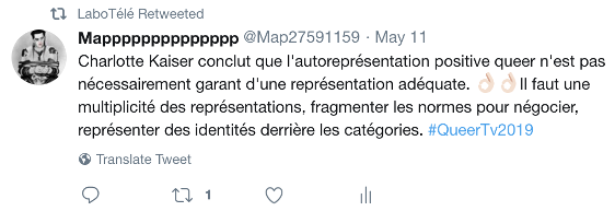 Description de l’image : Tweet publié par Mapppppppppppppp le 11 mai 2019. Texte de l’image : Charlotte Kaiser conclut que l’autoreprésentation positive queer n’est pas nécessairement garant d’une représentation adéquate. Il faut une multiplicité de représentations, fragmenter les normes pour négocier, représenter des identités derrière les catégories. #QueerTv2019