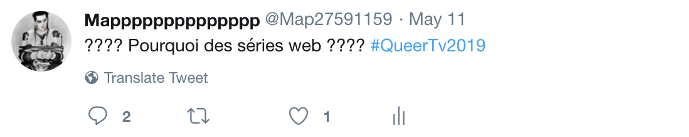 Description de l’image : Tweet publié par Mapppppppppppppp le 11 mai 2019. Texte de l’image : ???? Pourquoi des séries web ???? #QueerTV2019
