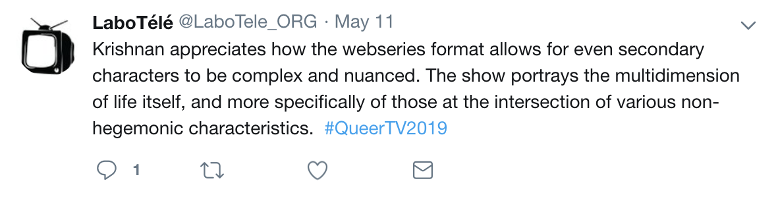 Description de l’image : Tweet publié par LaboTélé le 11 mai 2019. Texte de l’image : Krishnan appreciates how the webseries format allows for even secondaire characters to be complex and nuanced. The show portrays the multidimension of life itself, and more specifically of those at the intersection of various non-hegemonic characteristics. #QueerTV2019