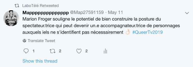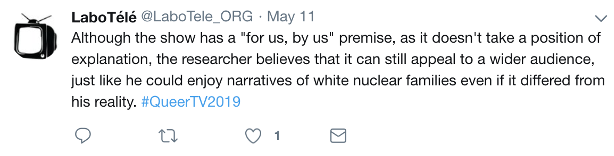 Description de l’image : Tweet publié par : LaboTélé le 11 mai 2019. Texte de l’image : Although the show has a « for us, by us » premise, as it doesn’t take a position of explanation, the researcher believes that it can still appeal to a wider audience, juste like he could enjoy narratives of white nuclear families even if it differed from his reality. #QueerTv2019