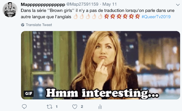 Description de l’image : Tweet publié par Mapppppppppppppp le 11 mai 2019. Texte de l’image : Dans la série « Brown Girls » il n’y a pas de traduction lorsqu’on parle dans une autre langue que l'anglais #QueerTv2019 + un GIF de Jennifer Anniston l’index sur le menton avec la mention « Hmm interesting..."