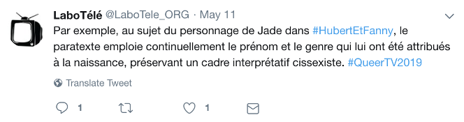 Description de l’image : Tweet publié par LaboTélé le 11 mai 2019. Texte de l’image : Par exemple, au sujet du personnage de Jade dans #HubertEtFanny, le paratexte emploie continuellement le prénom et le genre qui lui ont été attribués à la naissance, préservant un cadre interprétatif cissexiste #QueerTv2019