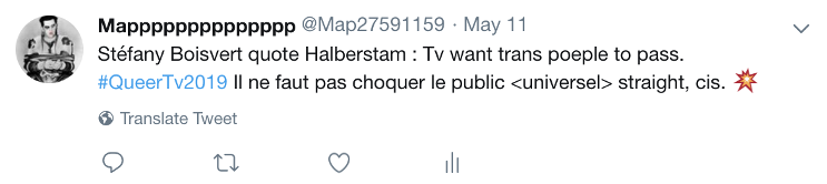 Description de l’image : Tweet publié par Mapppppppppppppp le 11 mai 2019. Texte de l’image : Stéfany Boisvert quote Halberstram : TV want trans people to pass. #QueerTv2019 Il ne faut pas choquer le public <universel> straight, cis.