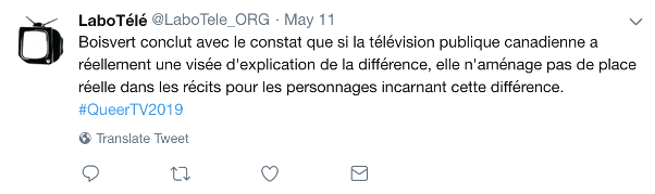 Description de l’image : Tweet publié par LaboTélé le 11 mai 2019. Texte de l’image : Boisvert conclut avec le constat que si la télévision publique canadienne a réellement une visée d’explication de la différence, elle n’aménage pas de place réelle dans les récits pour les personnages incarnant cette différence. #QueerTv2019
