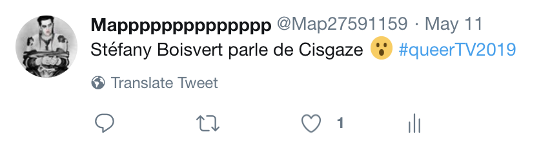 Description de l’image : Tweet publié par Mapppppppppppppp le 11 mai 2019. Texte de l’image : Stéfany Boisvert parle de Cisgaze #QueerTv2019