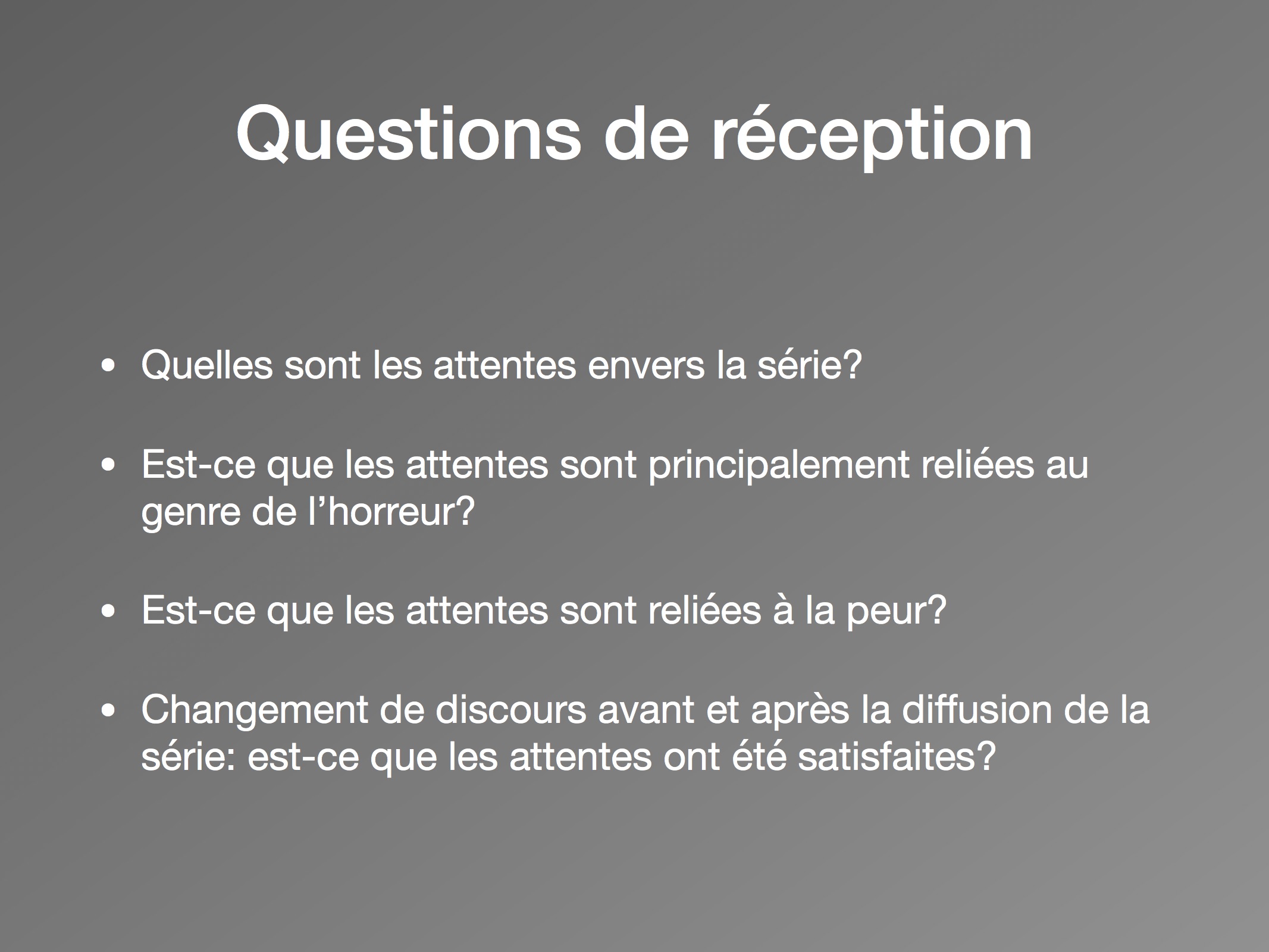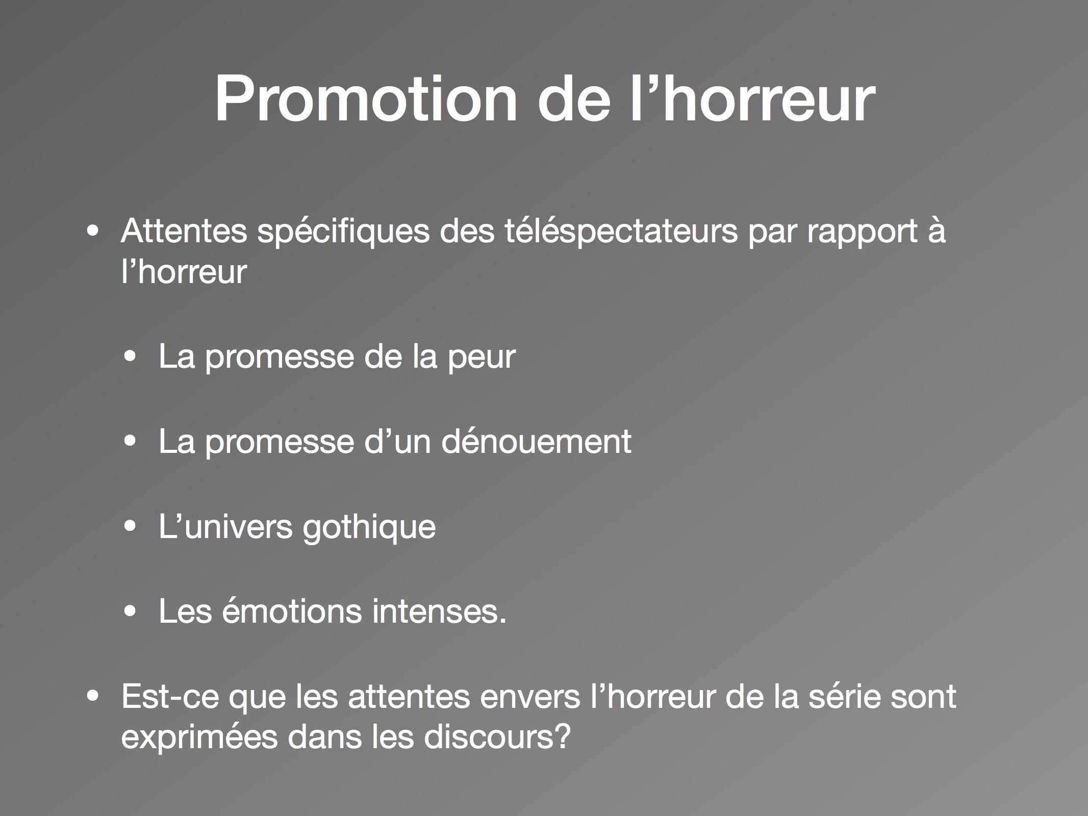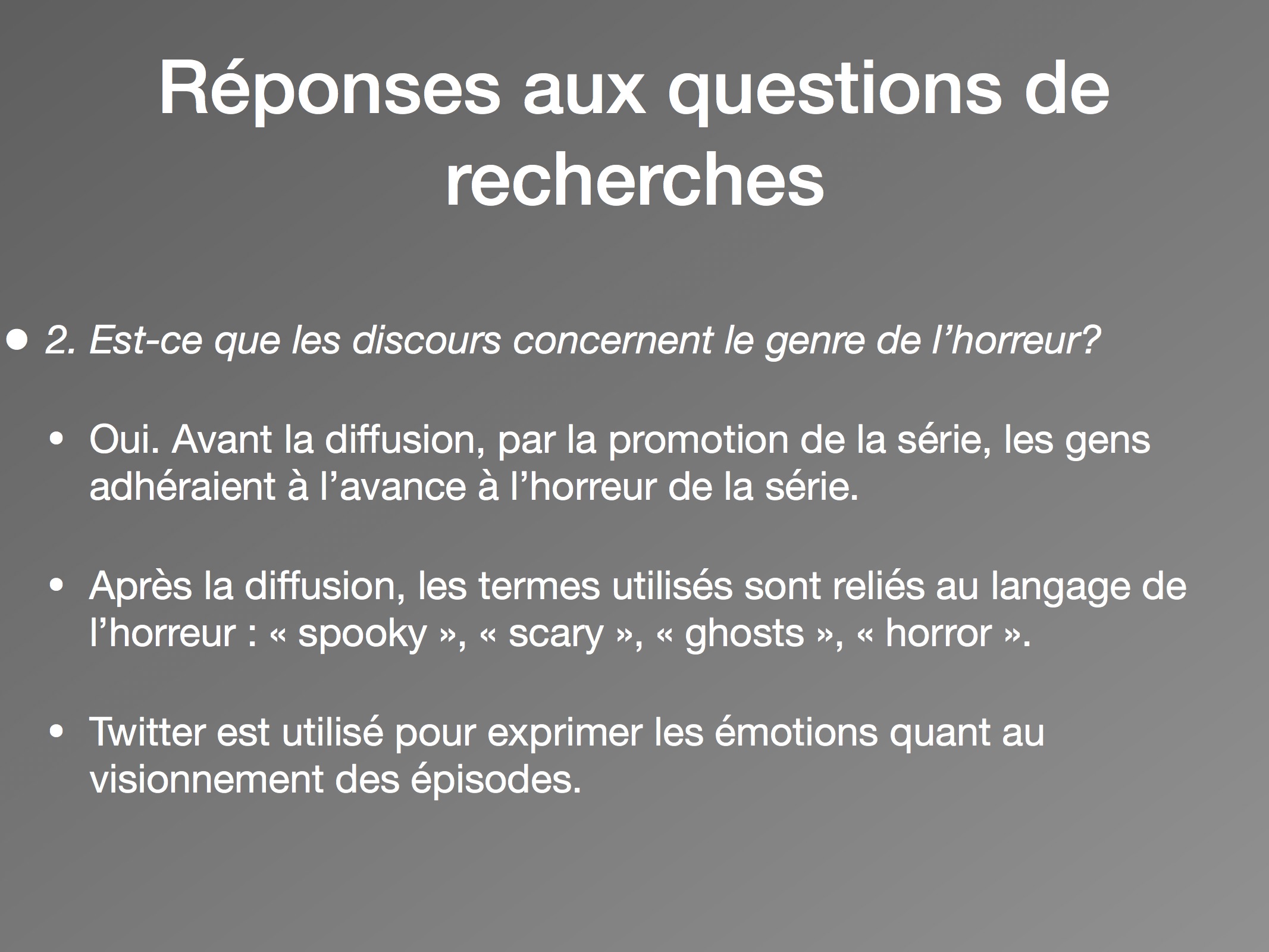 Pour répondre à la première question de recherche, nous constatons qu’il n’y avait pas réellement d’attentes envers la série avant sa diffusion, et que c’est après sa sortie que les utilisateurs de Twitter se rassemblent. Ensuite, les hypothèses se confirment autour de la deuxième question, puisque les nuages de mots nous indiquent qu’effectivement les spectateurs mentionnent des éléments d’horreur de la série, avant et après le 12 octobre. Avant la diffusion, les utilisateurs adhéraient à l’avance à l’horreur de la série, en partie par la promotion faite par Netflix. Ces attentes se sont transmises par la suite avec les impressions relayées sur Twitter, où des termes reliés au langage de l’horreur deviennent fréquents (« horror », « spooky », « ghosts » et « scary »). Pour la plupart, ils expriment leurs émotions en temps réel quant aux évènements dans les épisodes. Les discours sont donc devenus personnels, tels une façon se d’exprimer et de s’approprier le contenu de la série.