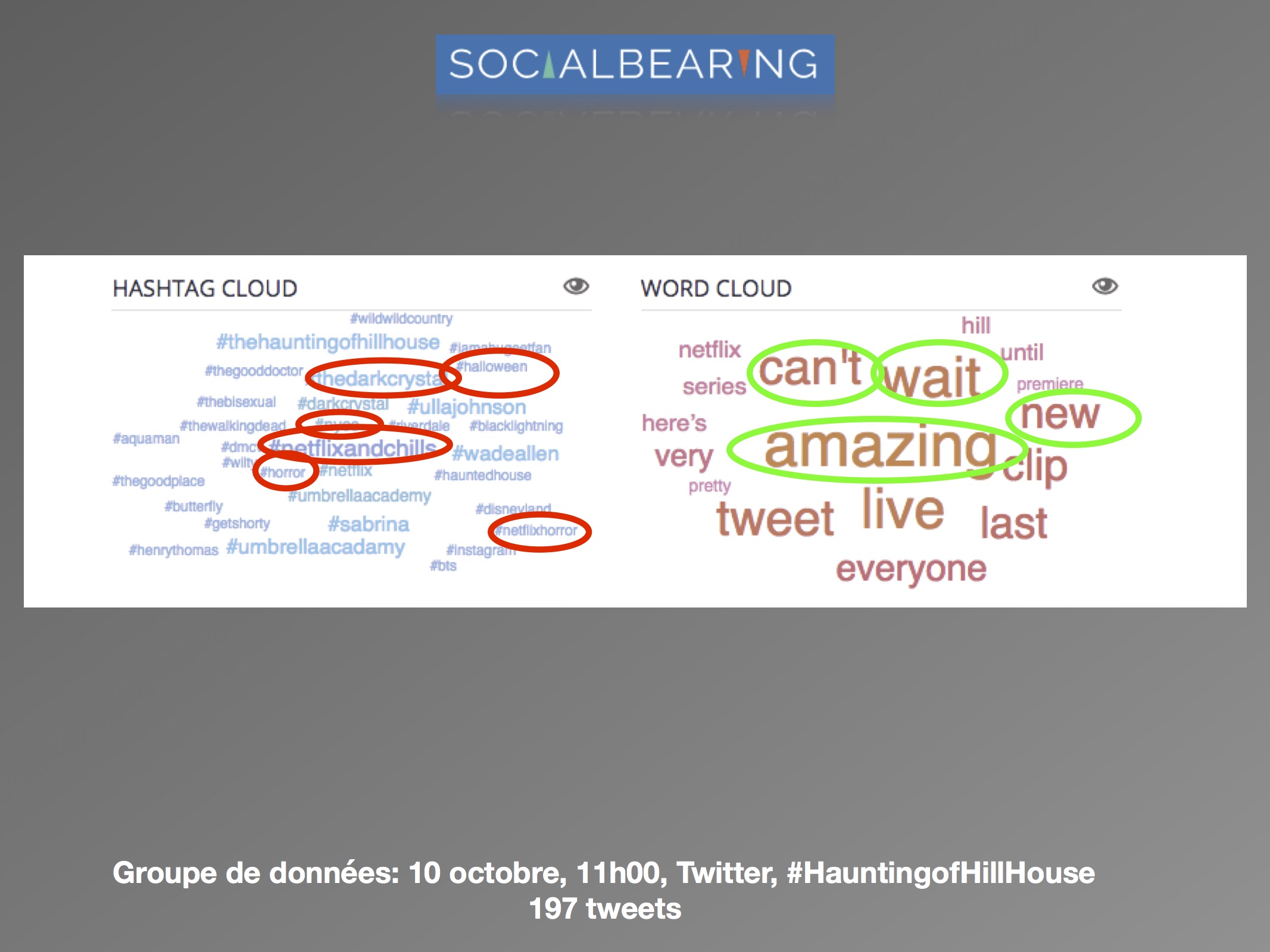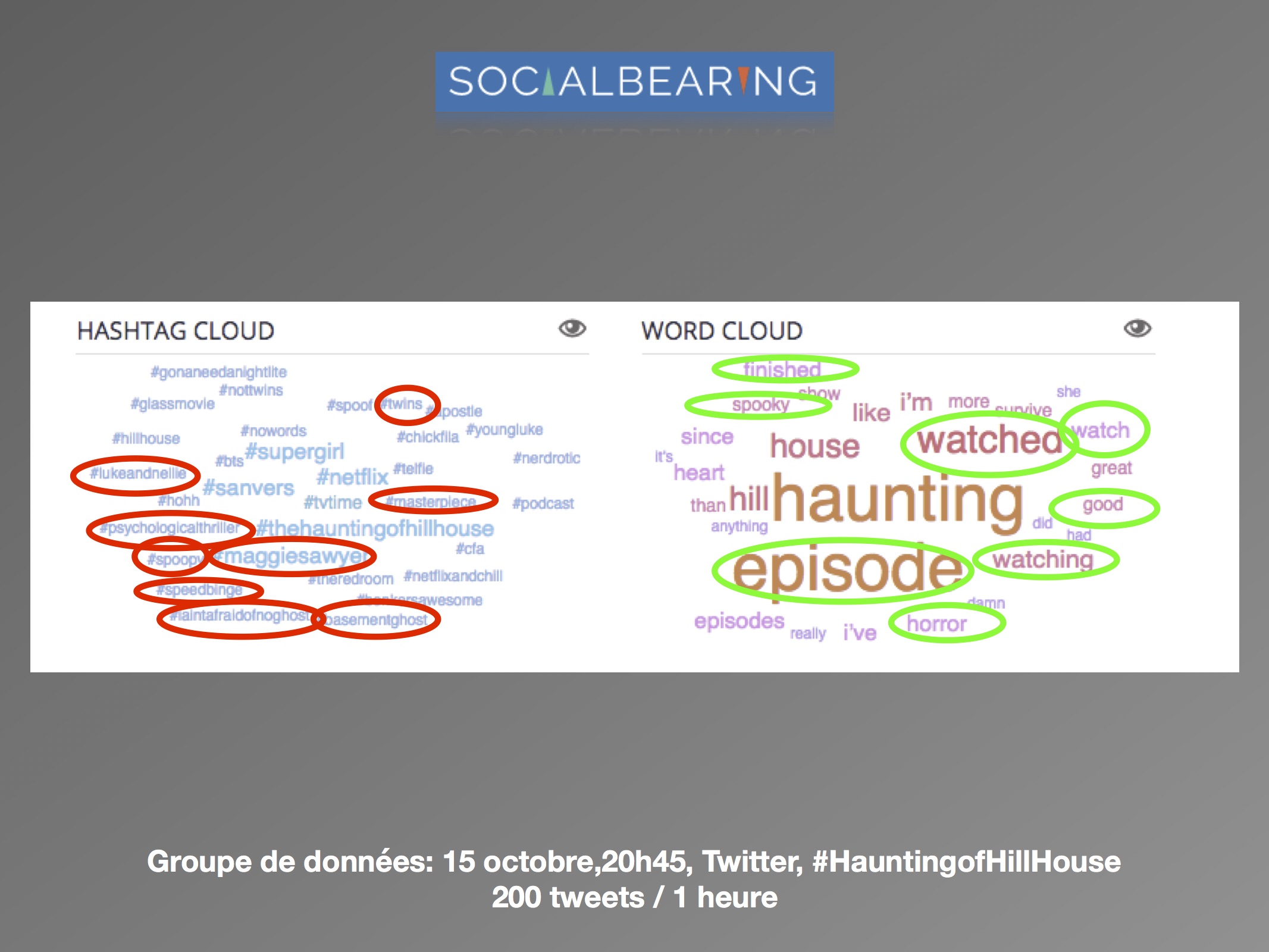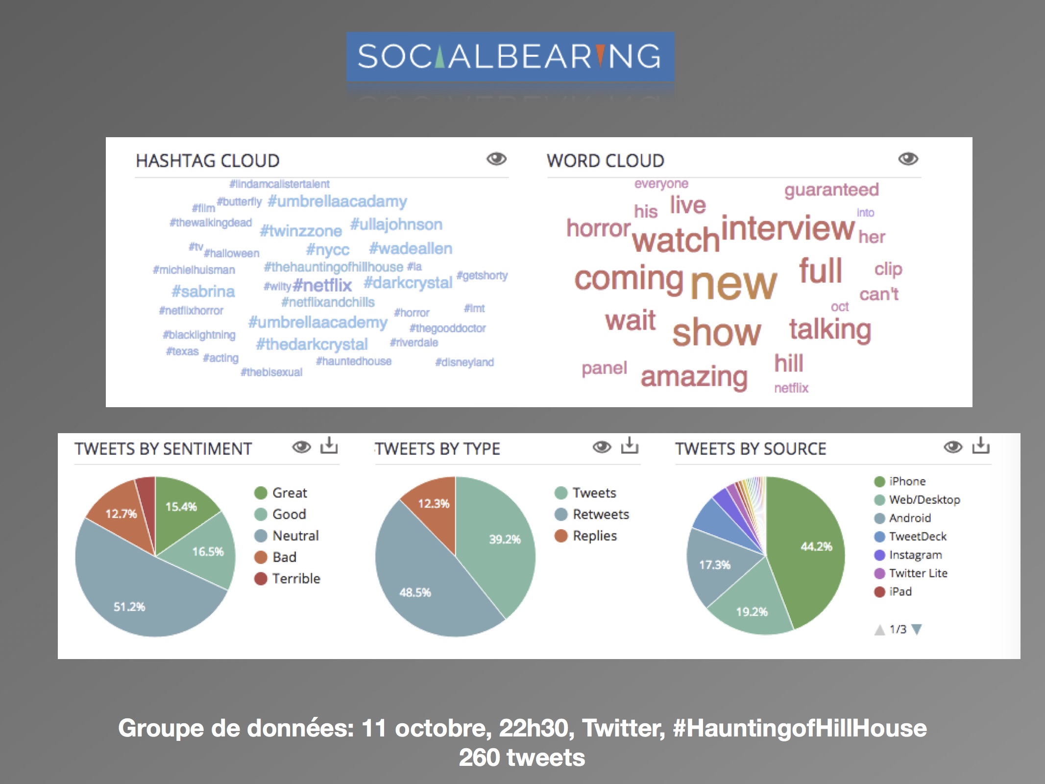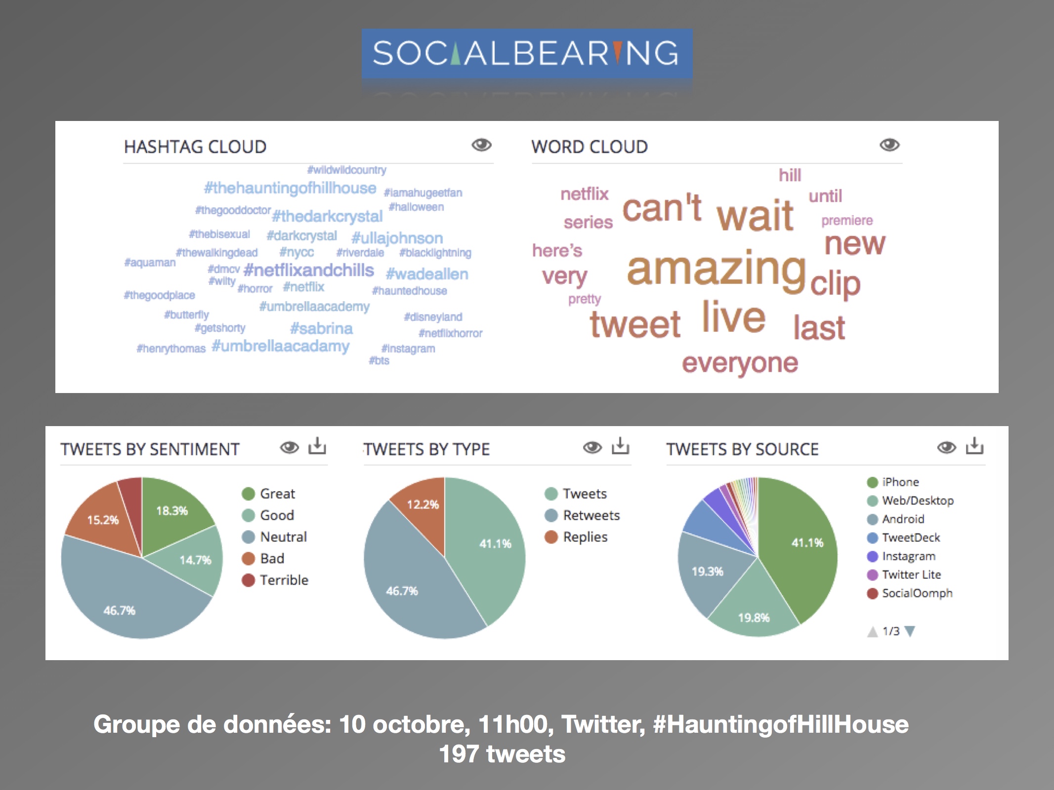 Dans une perspective d’analyse qualitative, l’axe de recherche se délimite à la comparaison des discours avant et après la sortie de la série, et de quelle façon est abordée le genre de l’horreur par les usagers. Les questions de réception se posent comme suit : (1) comment les attentes des téléspectateurs sont exprimées sur les réseaux sociaux? (2) Est-ce que les discours suivant la sortie concernent le genre de l’horreur? L’intérêt est surtout porté envers la façon dont les utilisateurs expriment leurs émotions ressenties face à la série. Les sites d’analyse Netlytic et Social Bearing ont été privilégiés pour des raisons pratiques d’accessibilité, de performance et de multiplicités des outils qualitatifs proposés. De la même façon, le champ d’analyse est réduit au réseau social Twitter. Les données ont été récoltées du 10 octobre au 15 octobre 2018, avec les termes de recherches suivants : « #HauntingofHillHouse ».