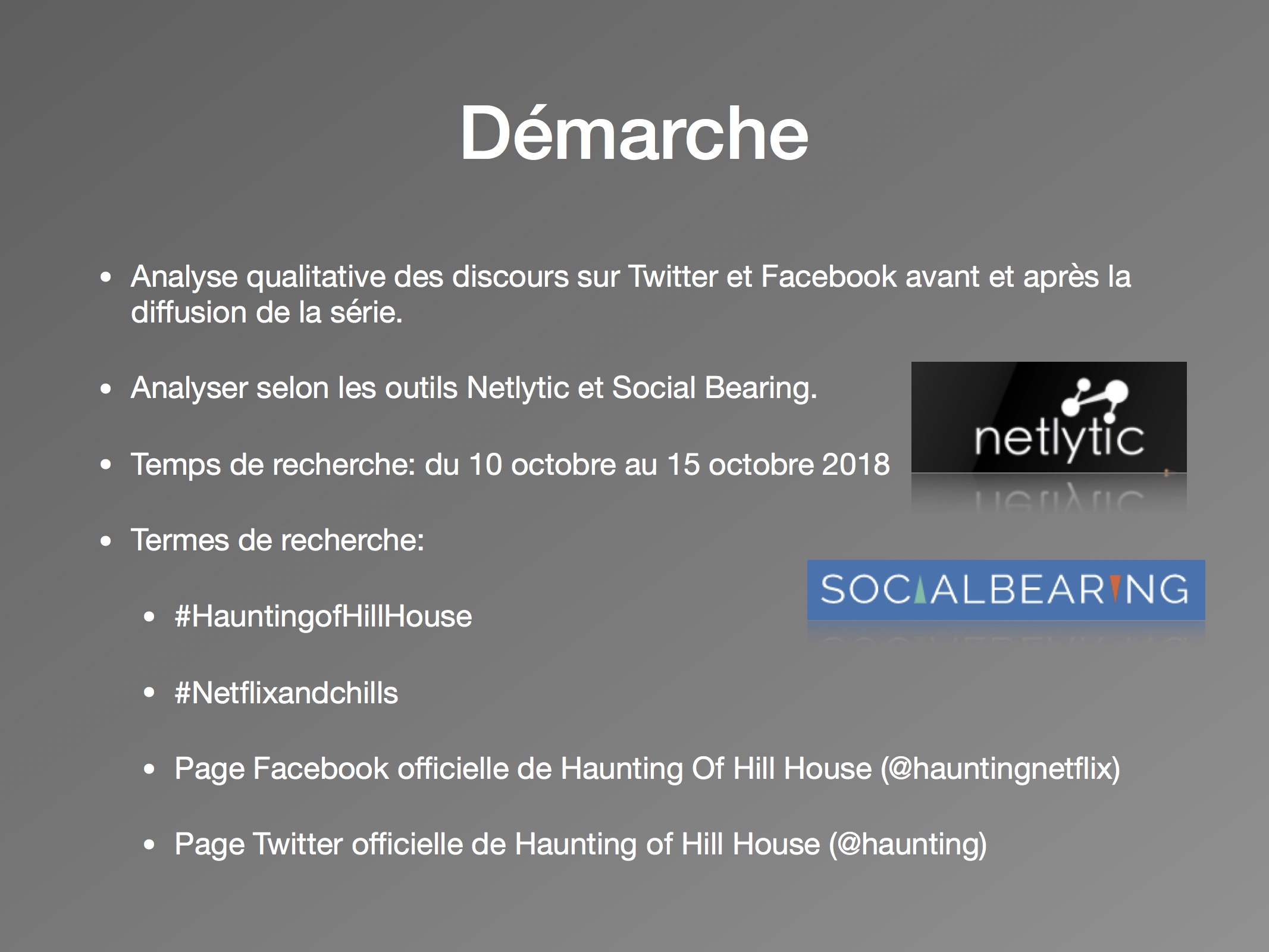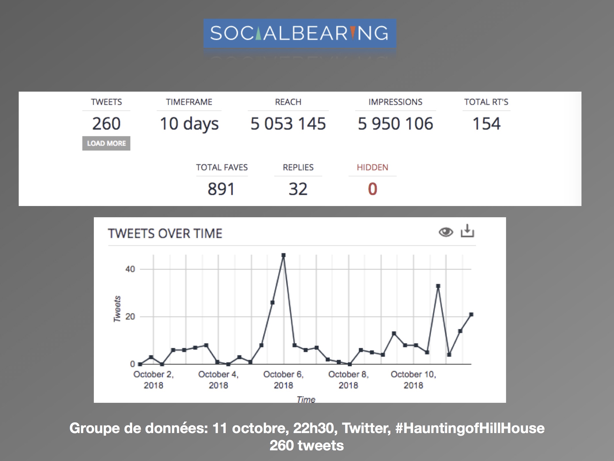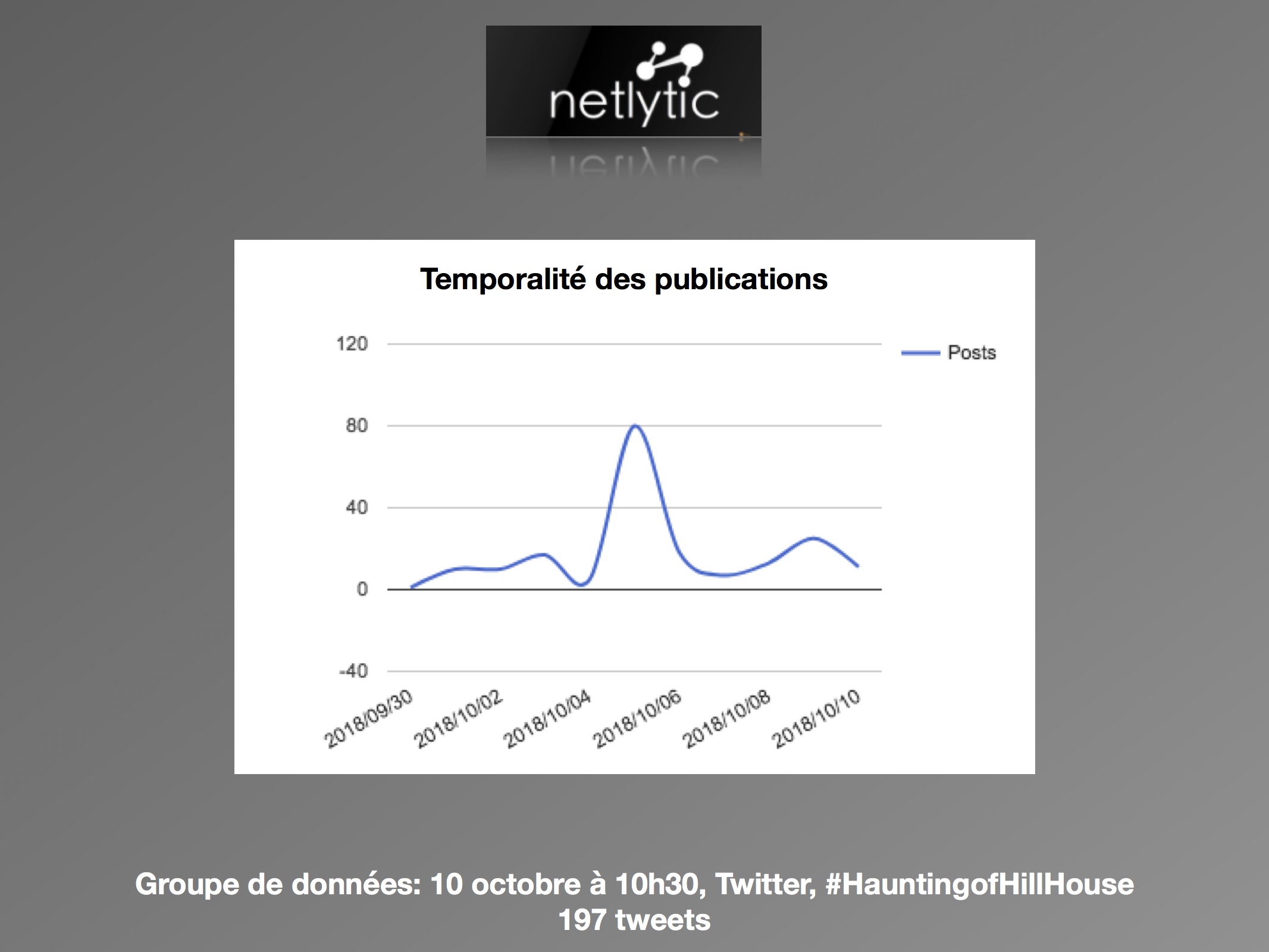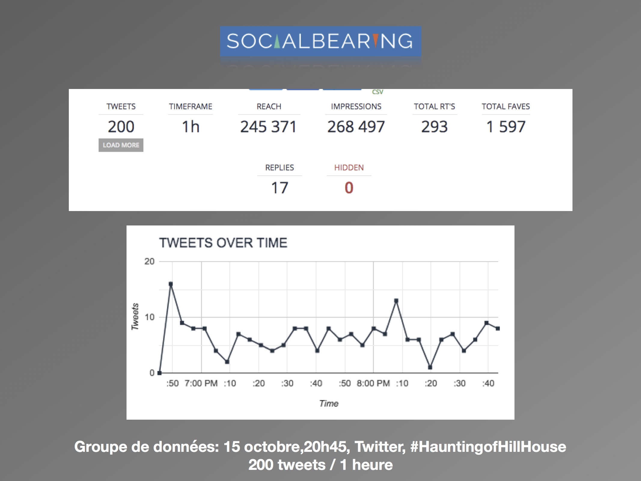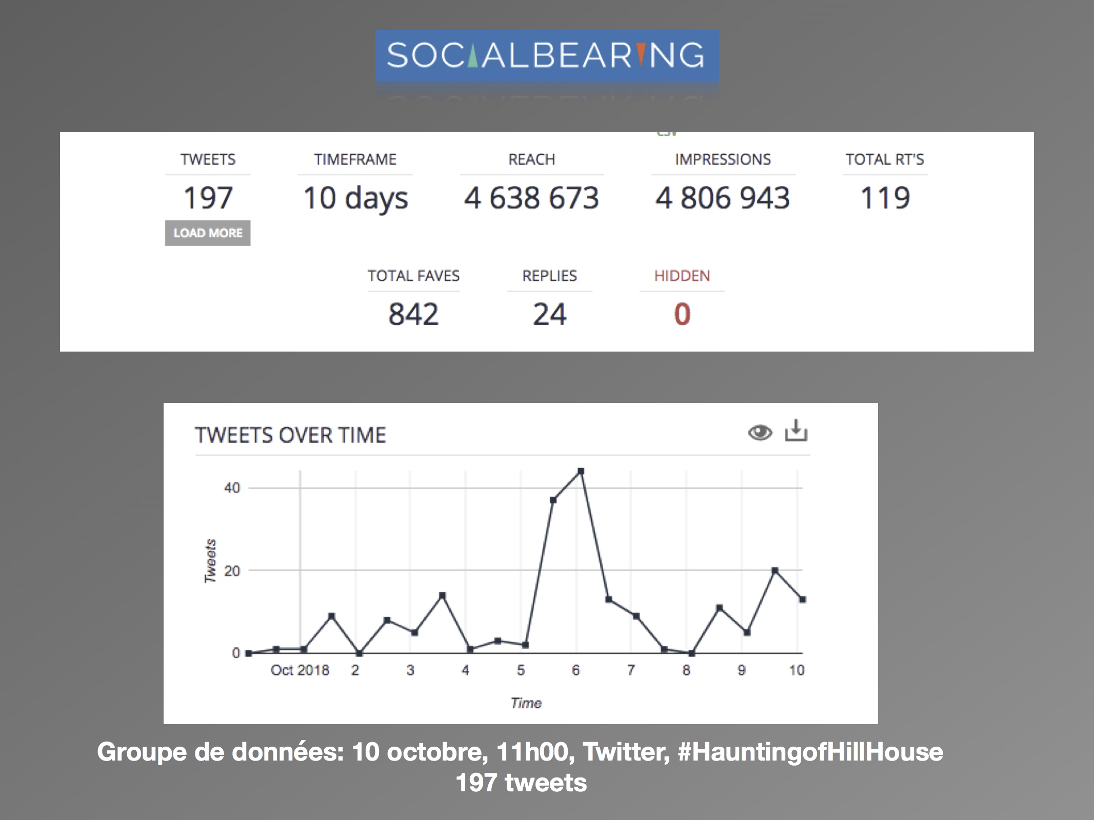 Dans une perspective d’analyse qualitative, l’axe de recherche se délimite à la comparaison des discours avant et après la sortie de la série, et de quelle façon est abordée le genre de l’horreur par les usagers. Les questions de réception se posent comme suit : (1) comment les attentes des téléspectateurs sont exprimées sur les réseaux sociaux? (2) Est-ce que les discours suivant la sortie concernent le genre de l’horreur? L’intérêt est surtout porté envers la façon dont les utilisateurs expriment leurs émotions ressenties face à la série. Les sites d’analyse Netlytic et Social Bearing ont été privilégiés pour des raisons pratiques d’accessibilité, de performance et de multiplicités des outils qualitatifs proposés. De la même façon, le champ d’analyse est réduit au réseau social Twitter. Les données ont été récoltées du 10 octobre au 15 octobre 2018, avec les termes de recherches suivants : « #HauntingofHillHouse ».