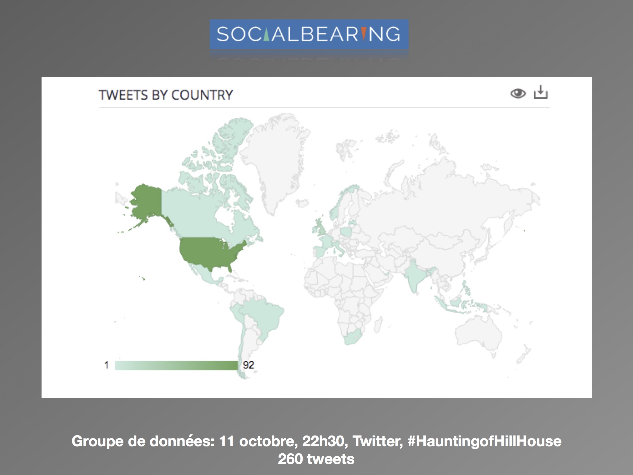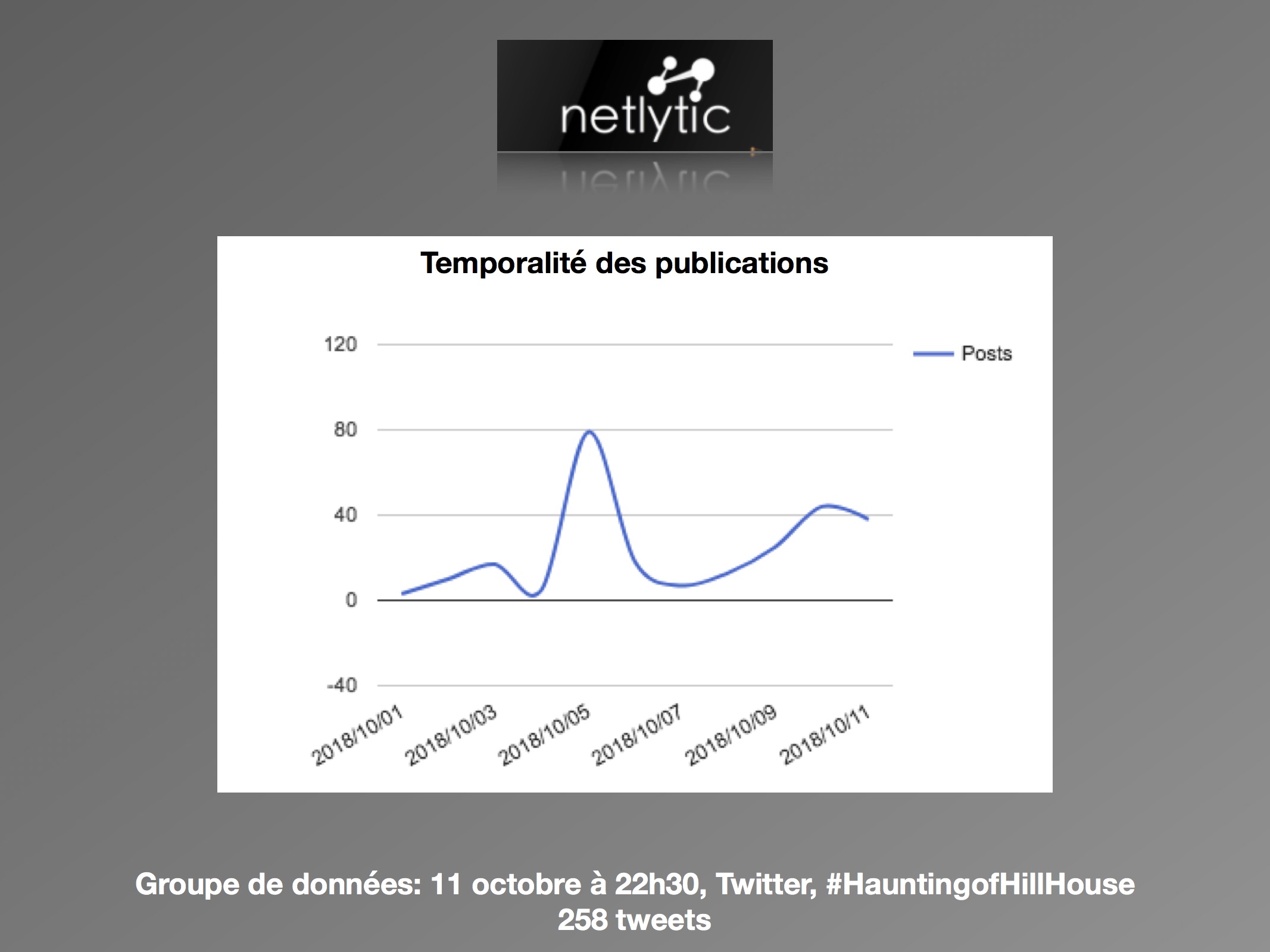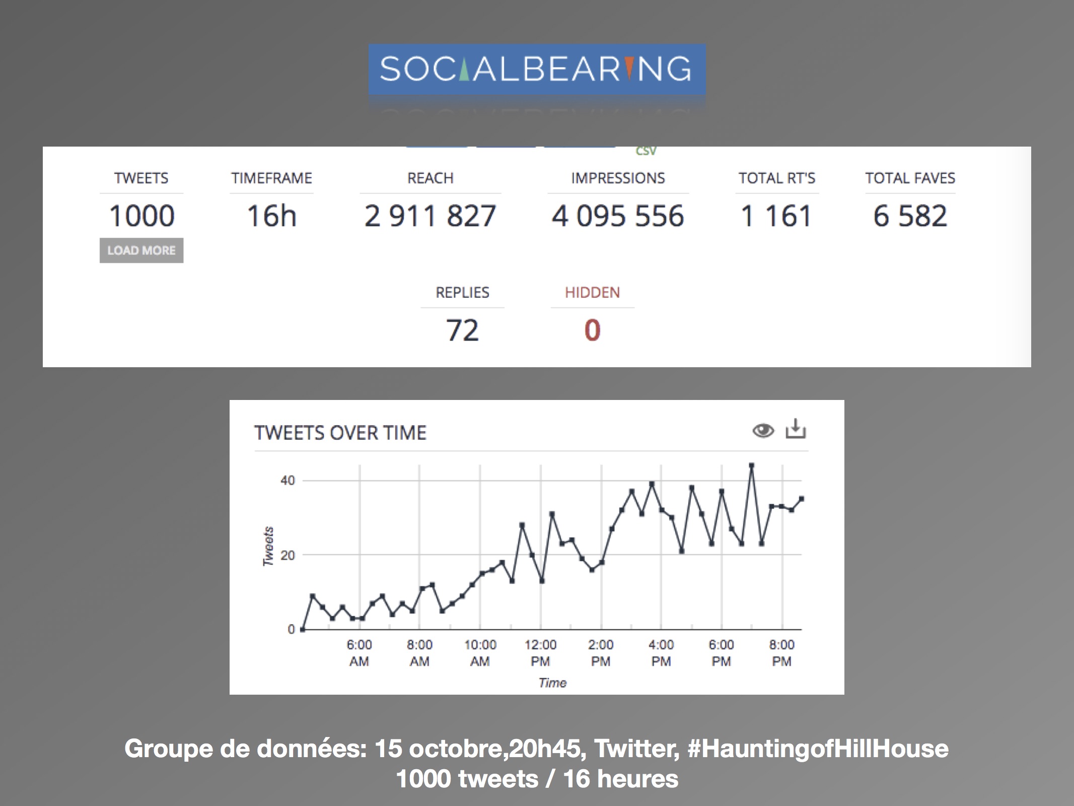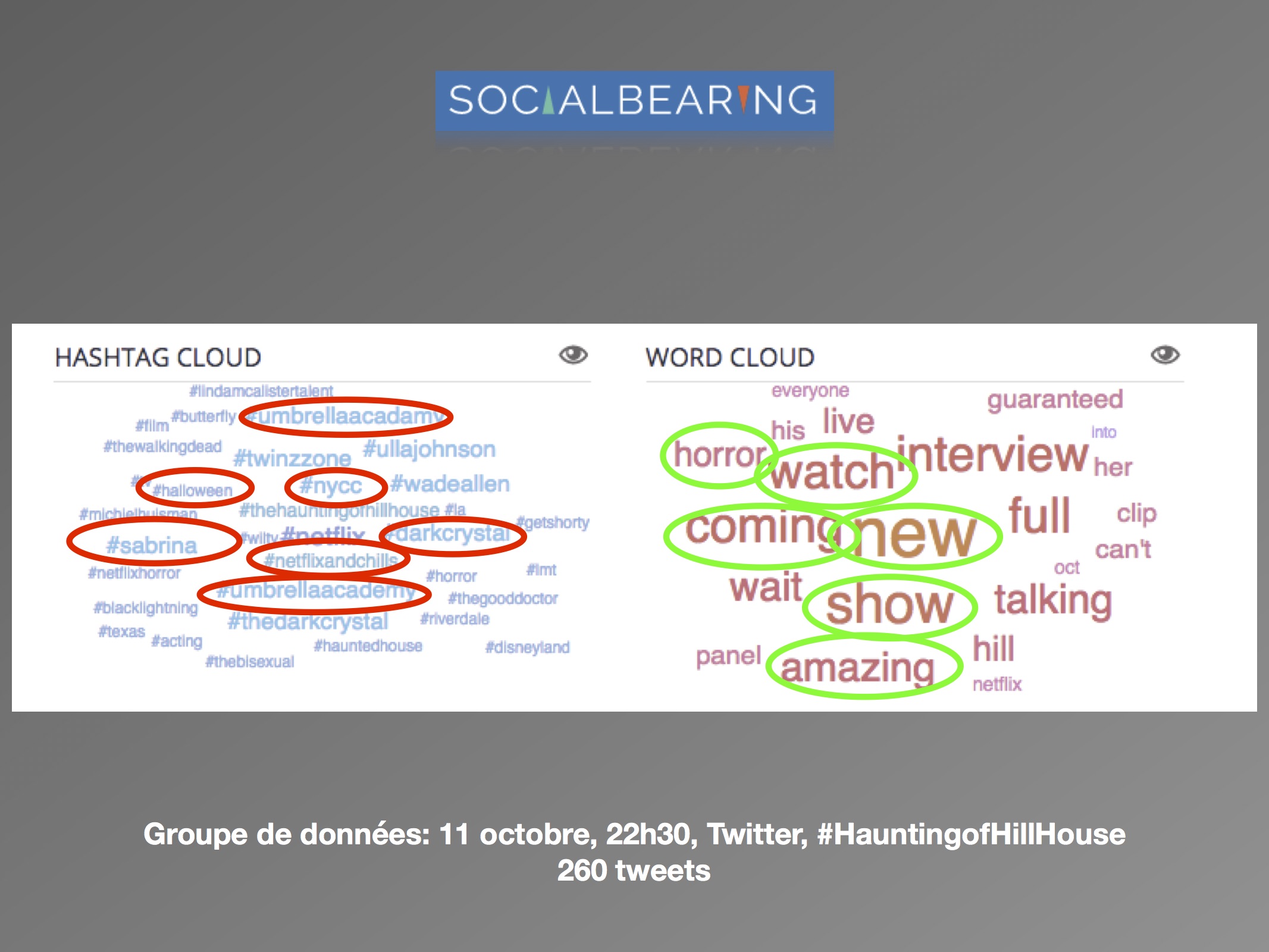 Dans une perspective d’analyse qualitative, l’axe de recherche se délimite à la comparaison des discours avant et après la sortie de la série, et de quelle façon est abordée le genre de l’horreur par les usagers. Les questions de réception se posent comme suit : (1) comment les attentes des téléspectateurs sont exprimées sur les réseaux sociaux? (2) Est-ce que les discours suivant la sortie concernent le genre de l’horreur? L’intérêt est surtout porté envers la façon dont les utilisateurs expriment leurs émotions ressenties face à la série. Les sites d’analyse Netlytic et Social Bearing ont été privilégiés pour des raisons pratiques d’accessibilité, de performance et de multiplicités des outils qualitatifs proposés. De la même façon, le champ d’analyse est réduit au réseau social Twitter. Les données ont été récoltées du 10 octobre au 15 octobre 2018, avec les termes de recherches suivants : « #HauntingofHillHouse ».