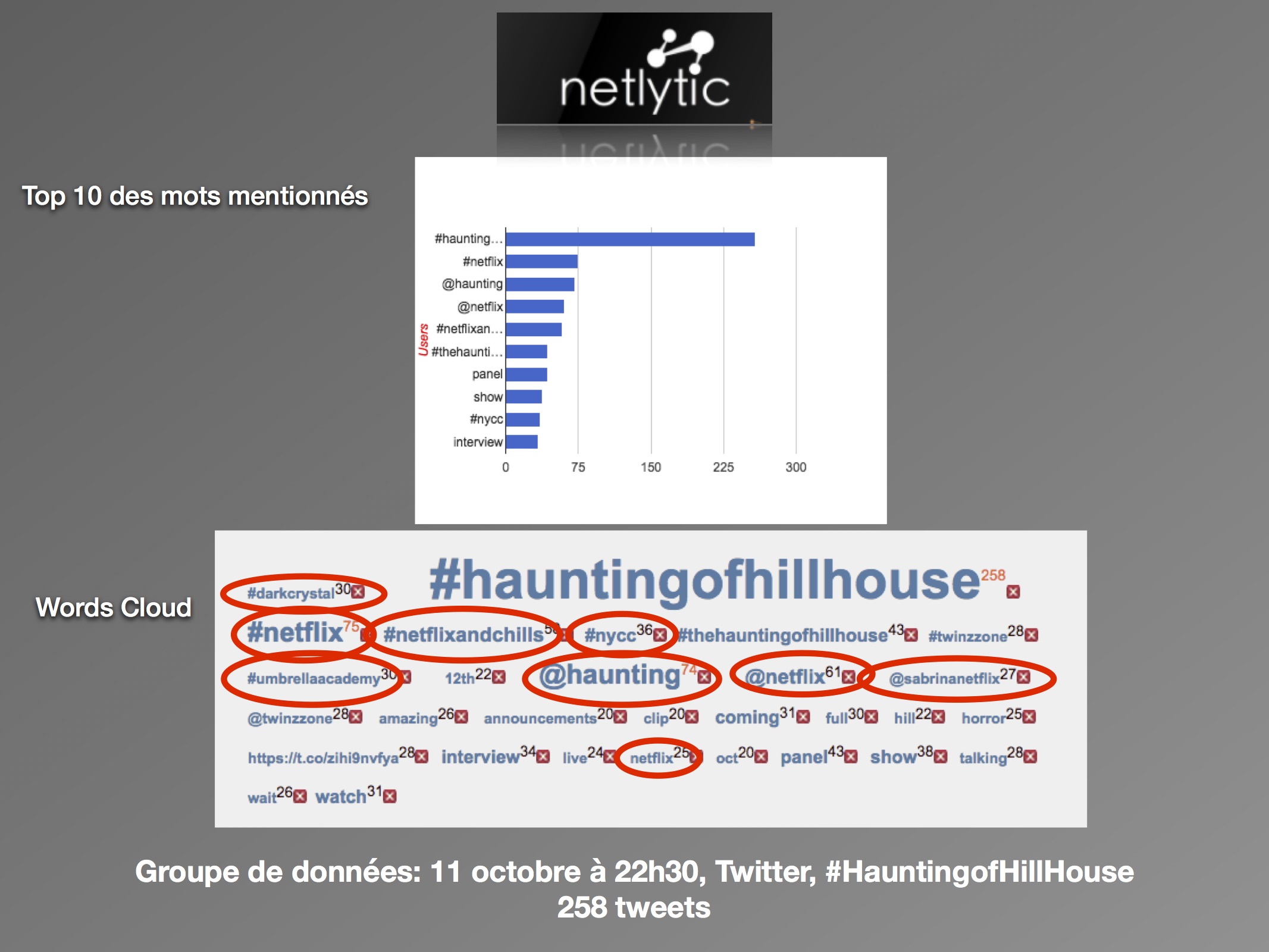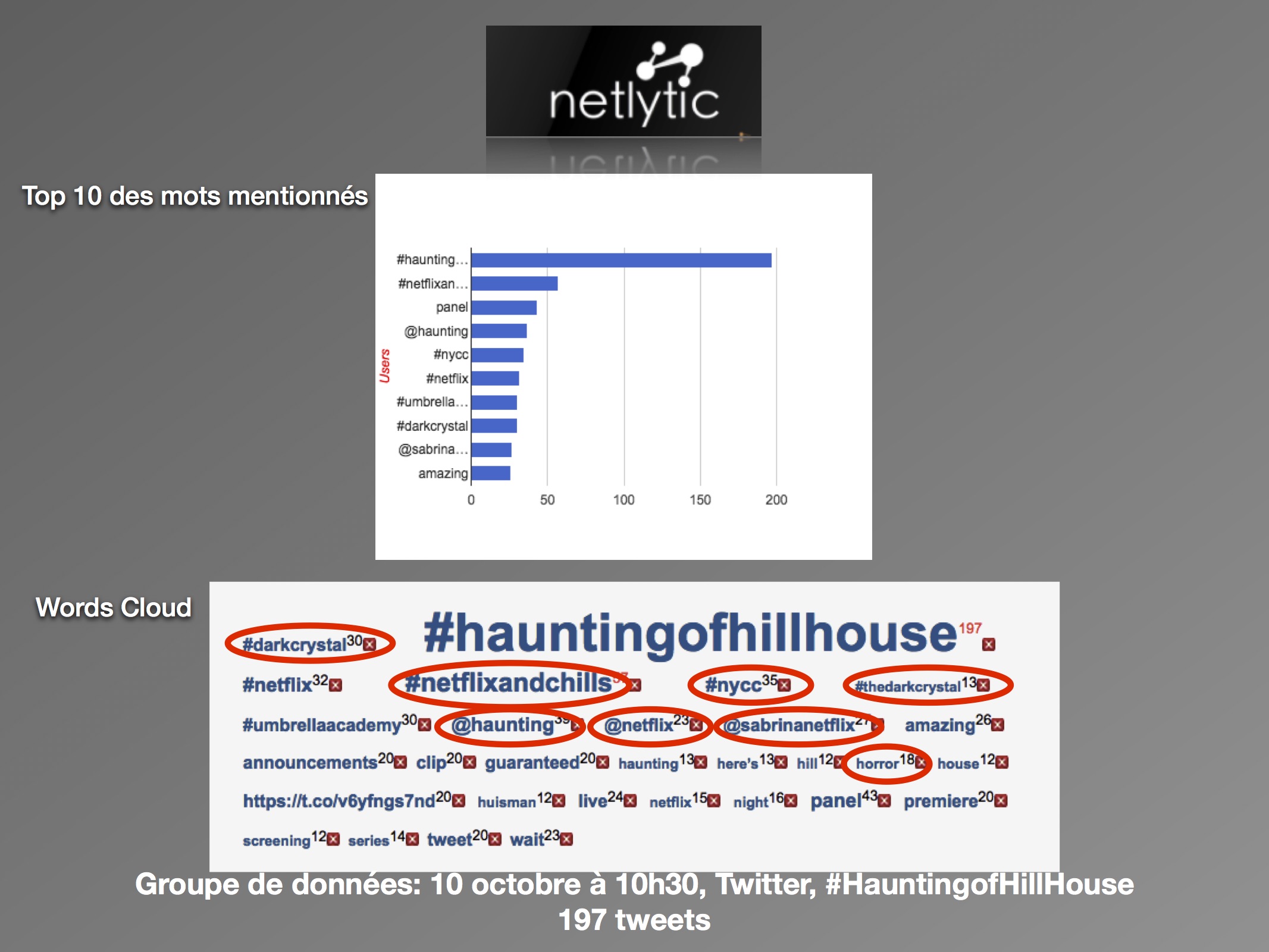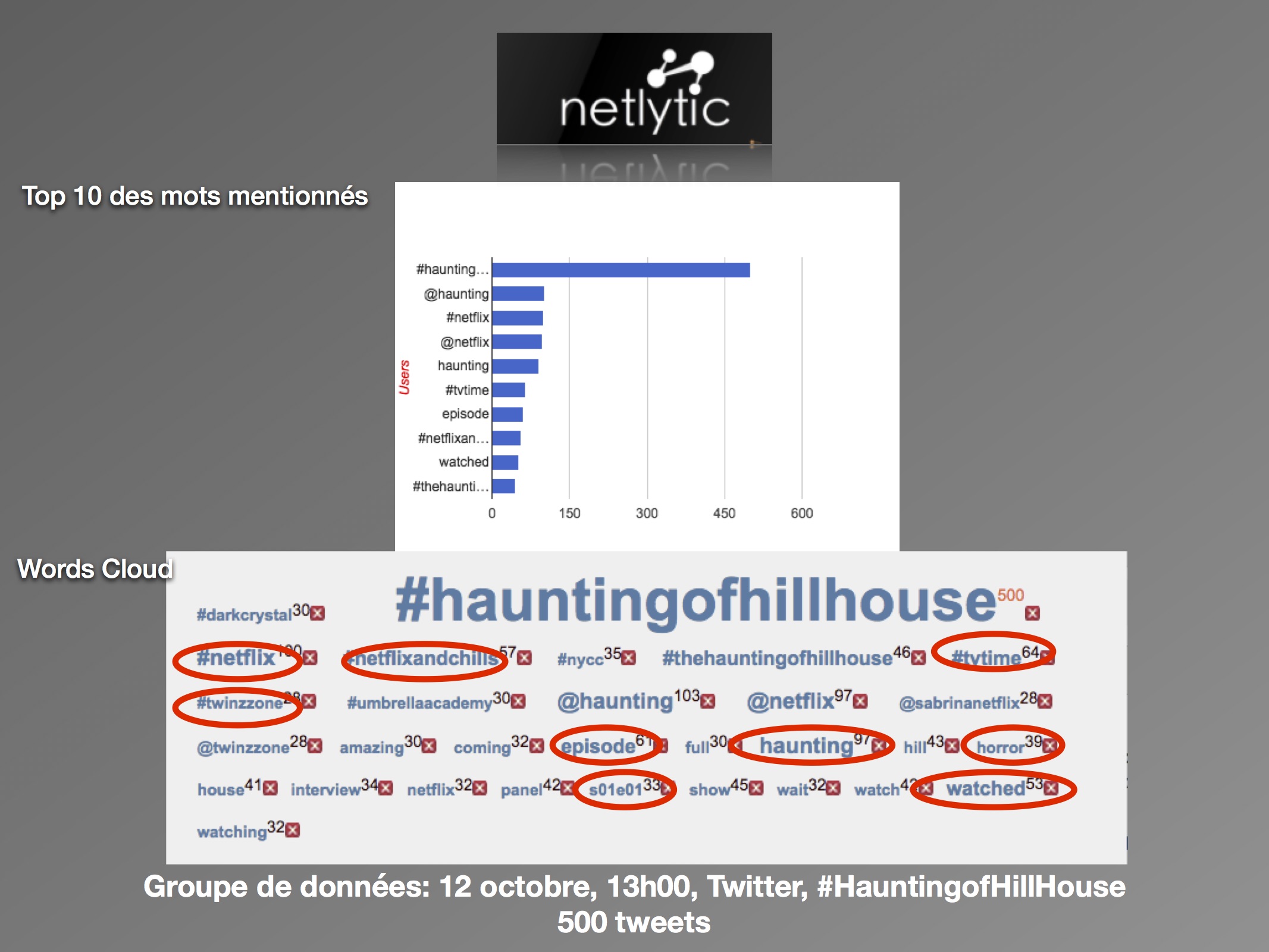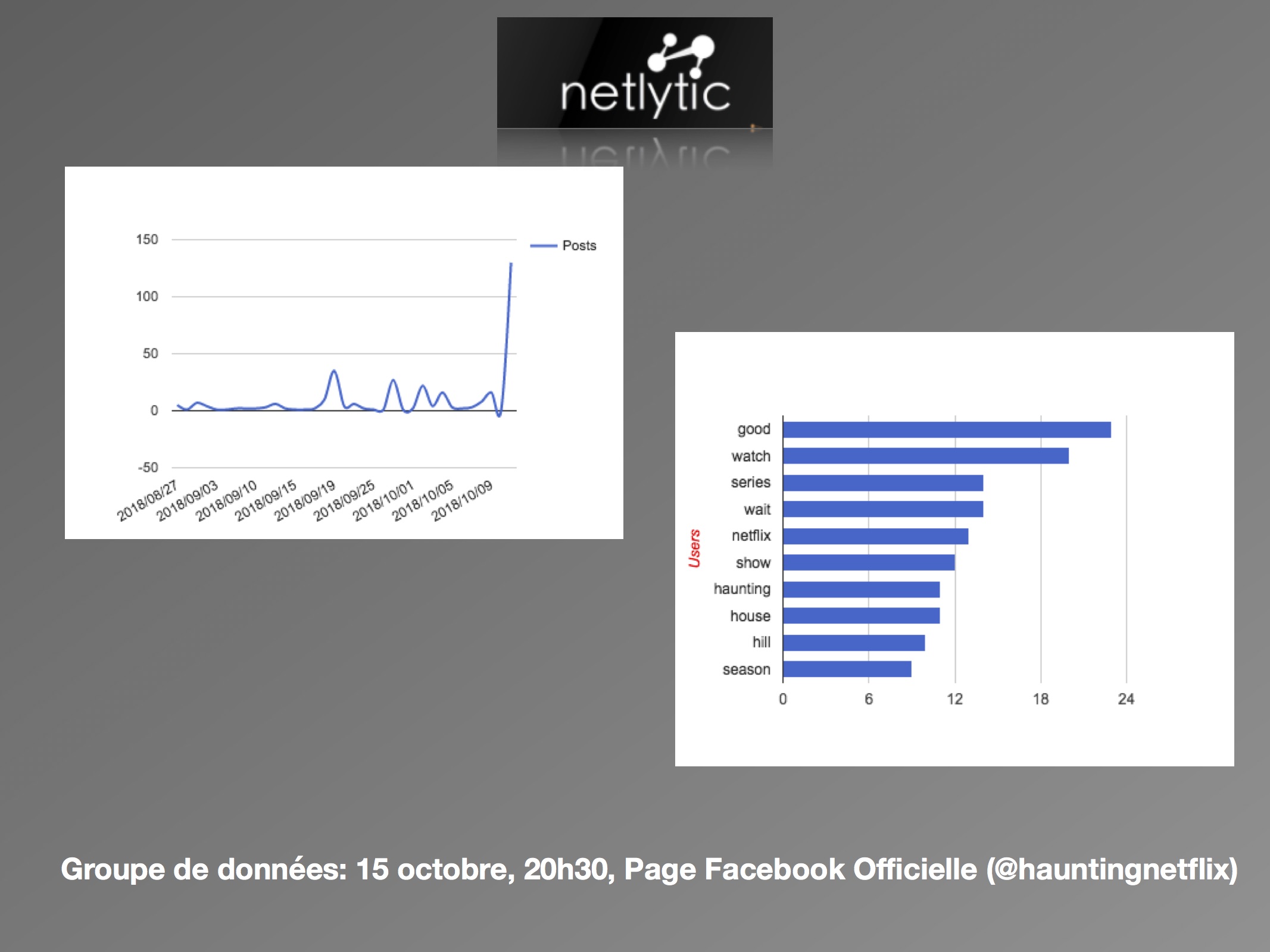 Sur les deux jours, nous pouvons conclure à un nombre faible de discours, et notamment peu de tweets originaux. Les utilisateurs partagent des nouvelles sur la série, plutôt que de partager leurs propres opinions face à elle. Ils s’engagent dans la stratégie commerciale de Netflix, en créant un réseau de discussion autour du « #NetflixandChills » et de ses séries associées. Malgré tout, l’horreur est présente avec des mentions fréquentes du mot « horror » et des mots-clics « #halloween » et « #ghosts ». Les multiples présences du « #Netflix » démontrent d’une forte appartenance de la série à sa plateforme. Pour les utilisateurs, The Haunting of Hill House appartient à la marque Netflix, et les attentes sont construites en conséquence. Ainsi, le taux faible d’activités permet de conclure qu’il y a peu d’attentes autour de la série comme telle, mais plutôt envers le mois de l’horreur annoncé.