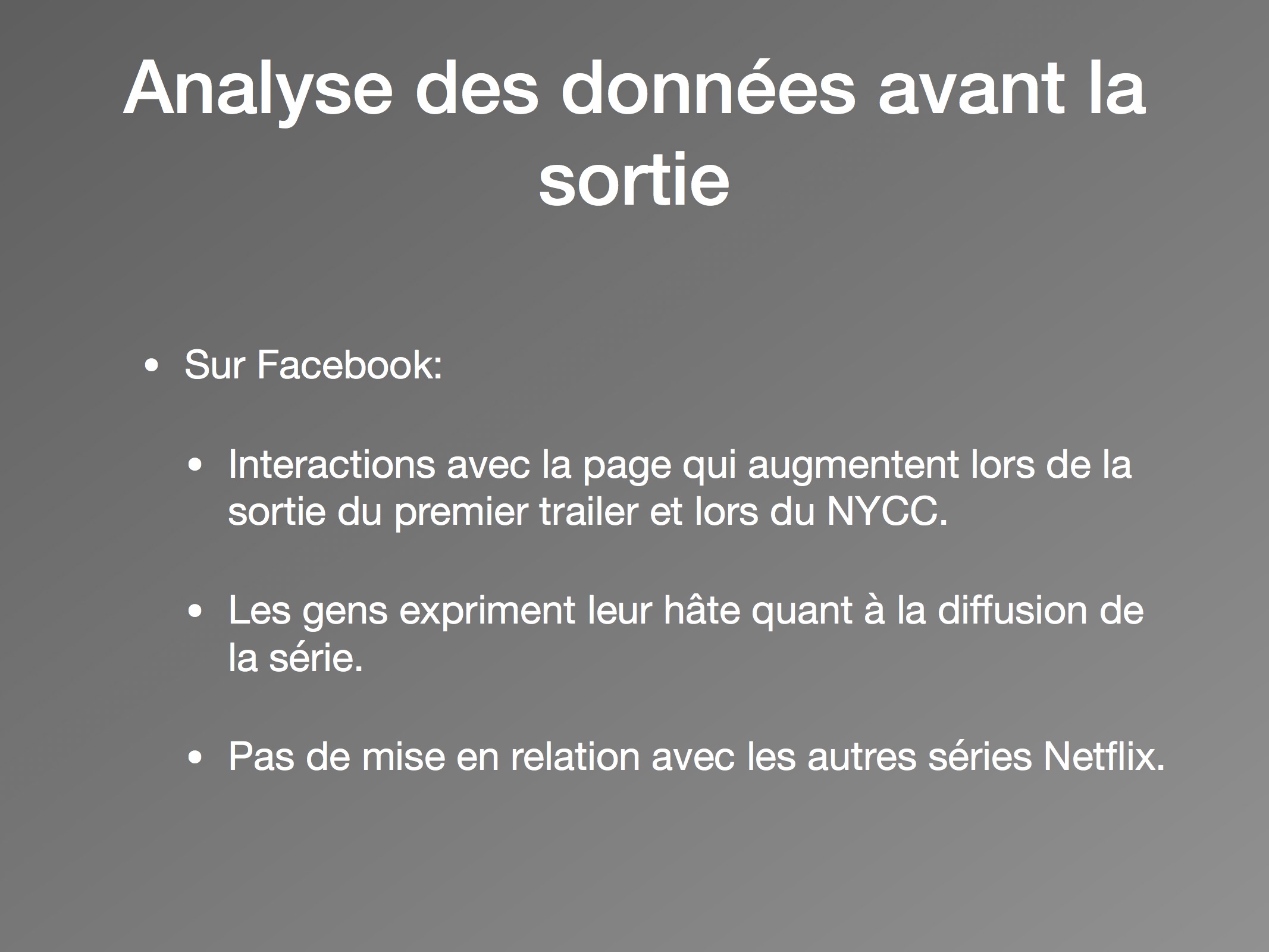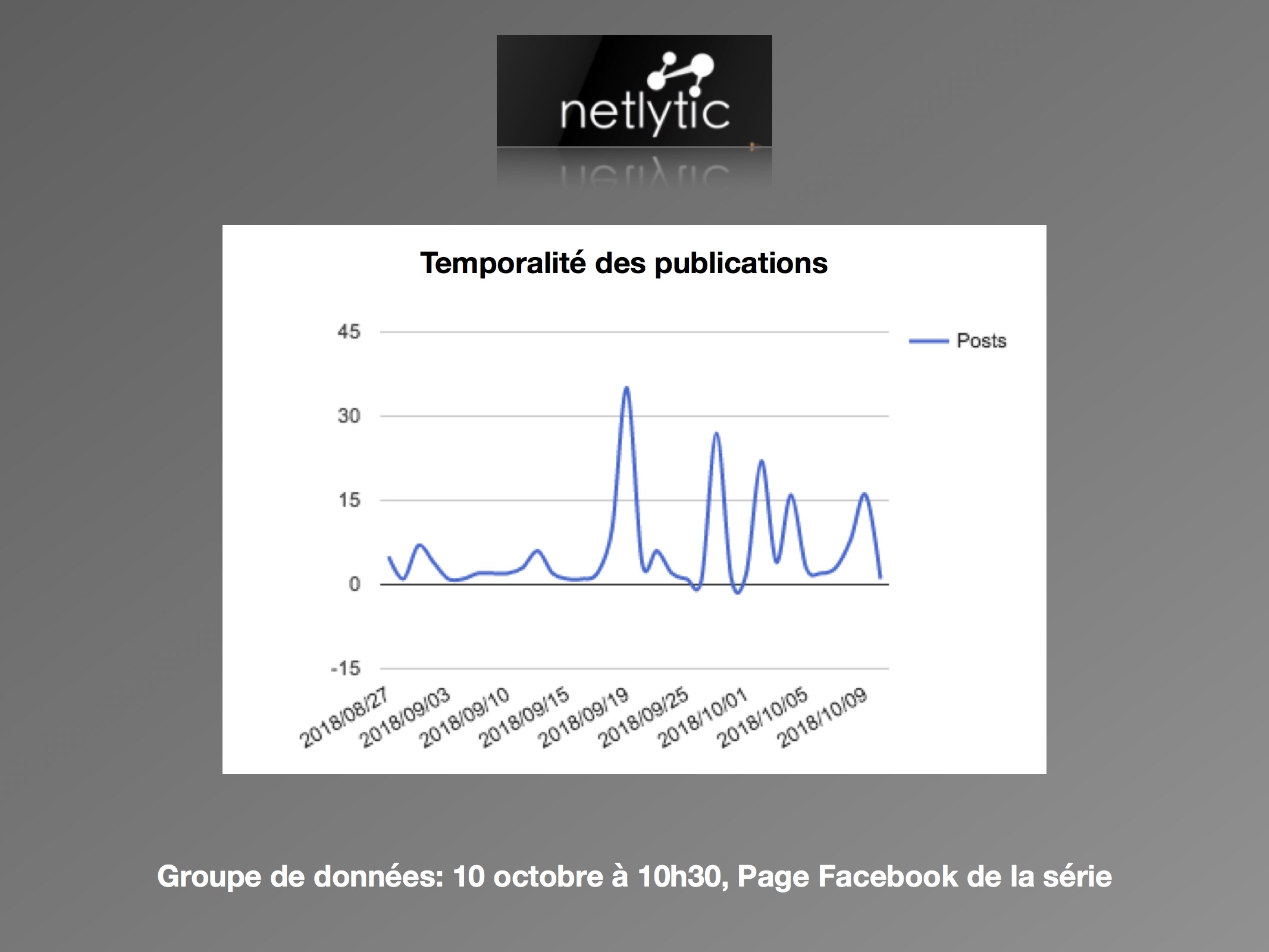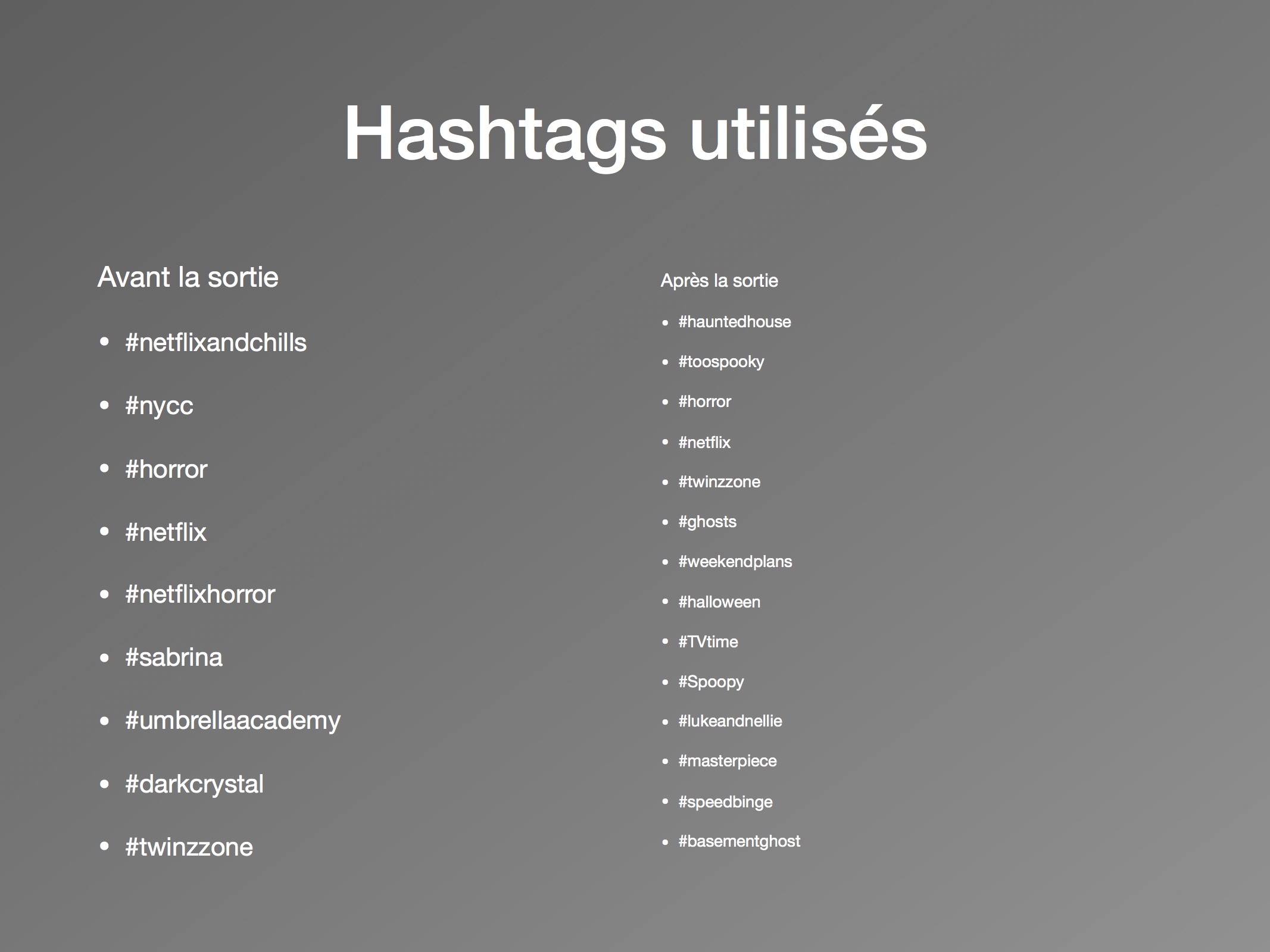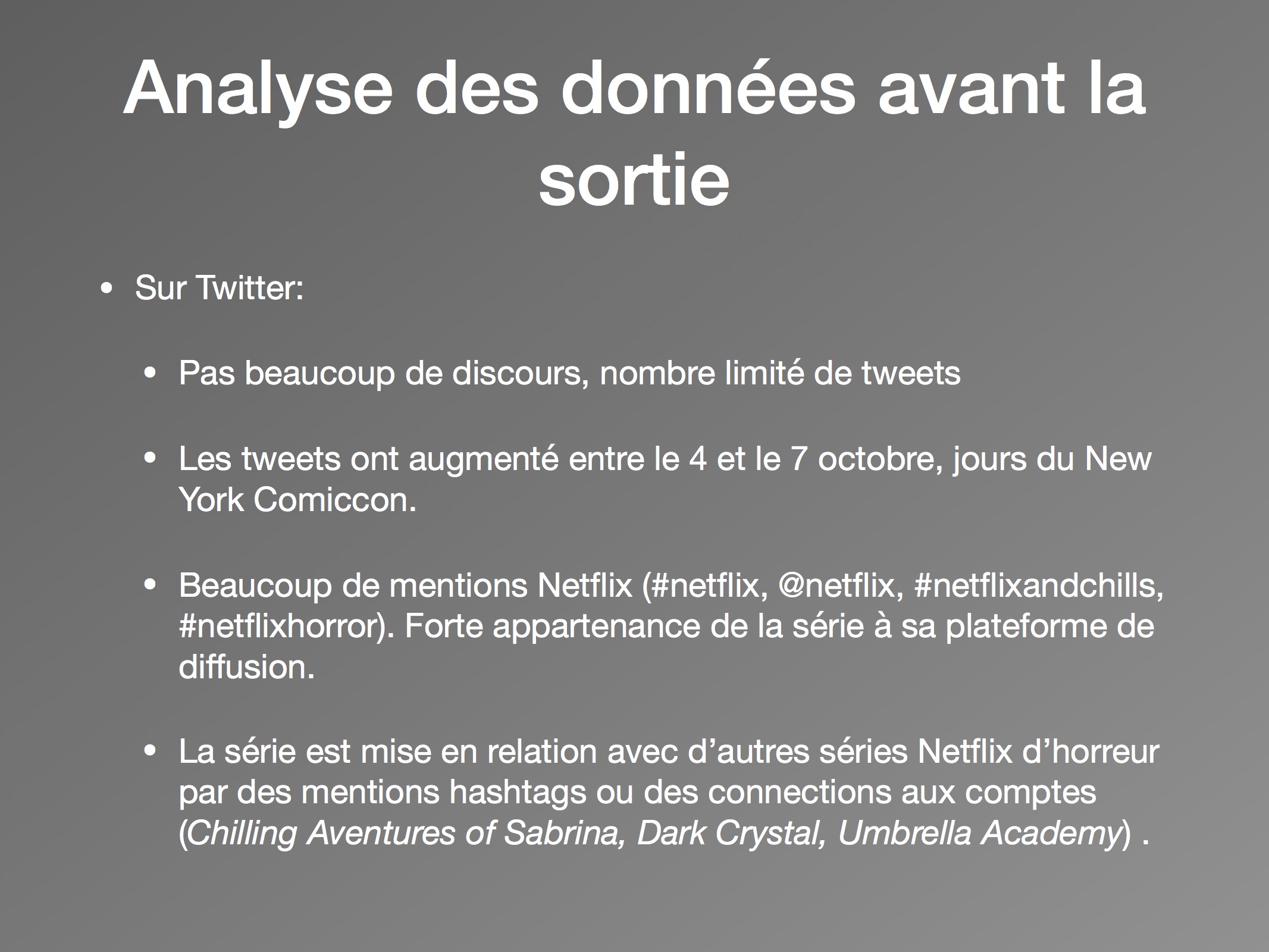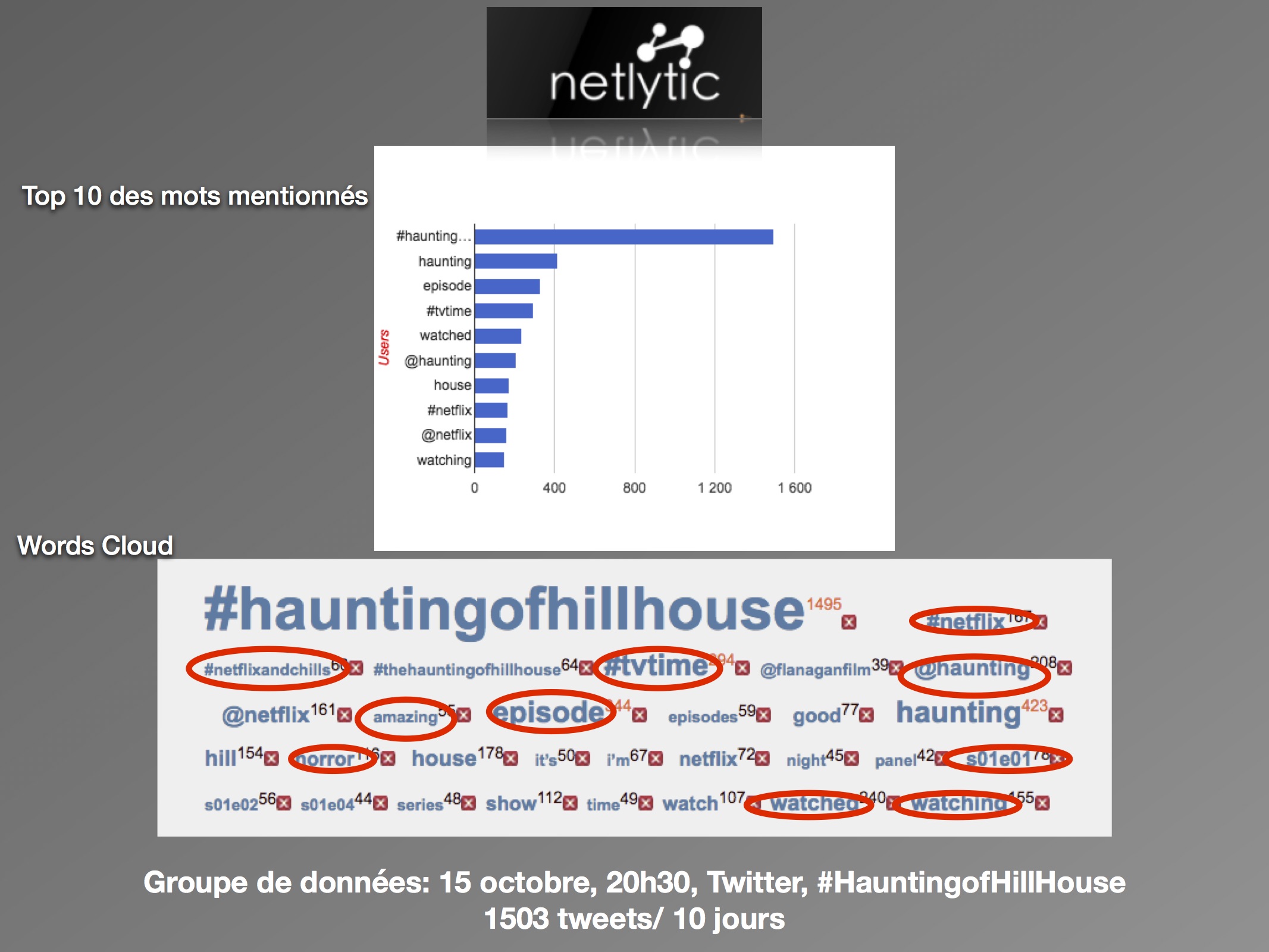 Sur les deux jours, nous pouvons conclure à un nombre faible de discours, et notamment peu de tweets originaux. Les utilisateurs partagent des nouvelles sur la série, plutôt que de partager leurs propres opinions face à elle. Ils s’engagent dans la stratégie commerciale de Netflix, en créant un réseau de discussion autour du « #NetflixandChills » et de ses séries associées. Malgré tout, l’horreur est présente avec des mentions fréquentes du mot « horror » et des mots-clics « #halloween » et « #ghosts ». Les multiples présences du « #Netflix » démontrent d’une forte appartenance de la série à sa plateforme. Pour les utilisateurs, The Haunting of Hill House appartient à la marque Netflix, et les attentes sont construites en conséquence. Ainsi, le taux faible d’activités permet de conclure qu’il y a peu d’attentes autour de la série comme telle, mais plutôt envers le mois de l’horreur annoncé.
