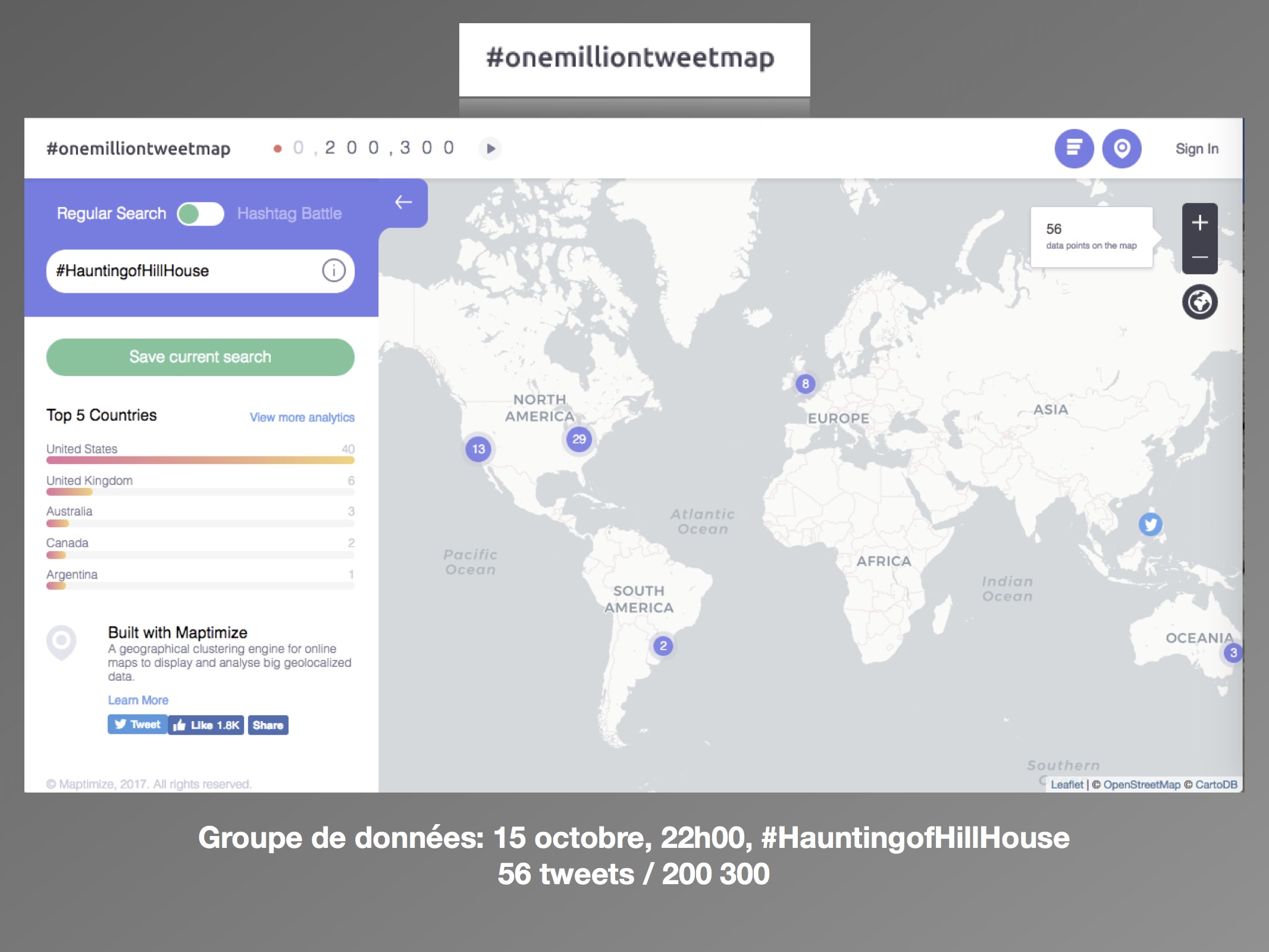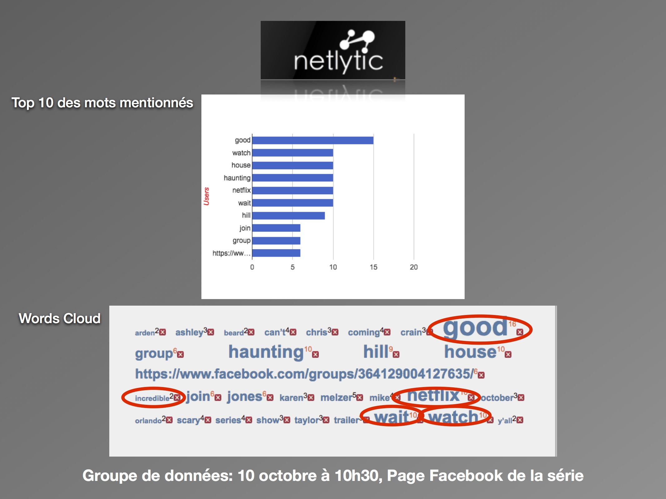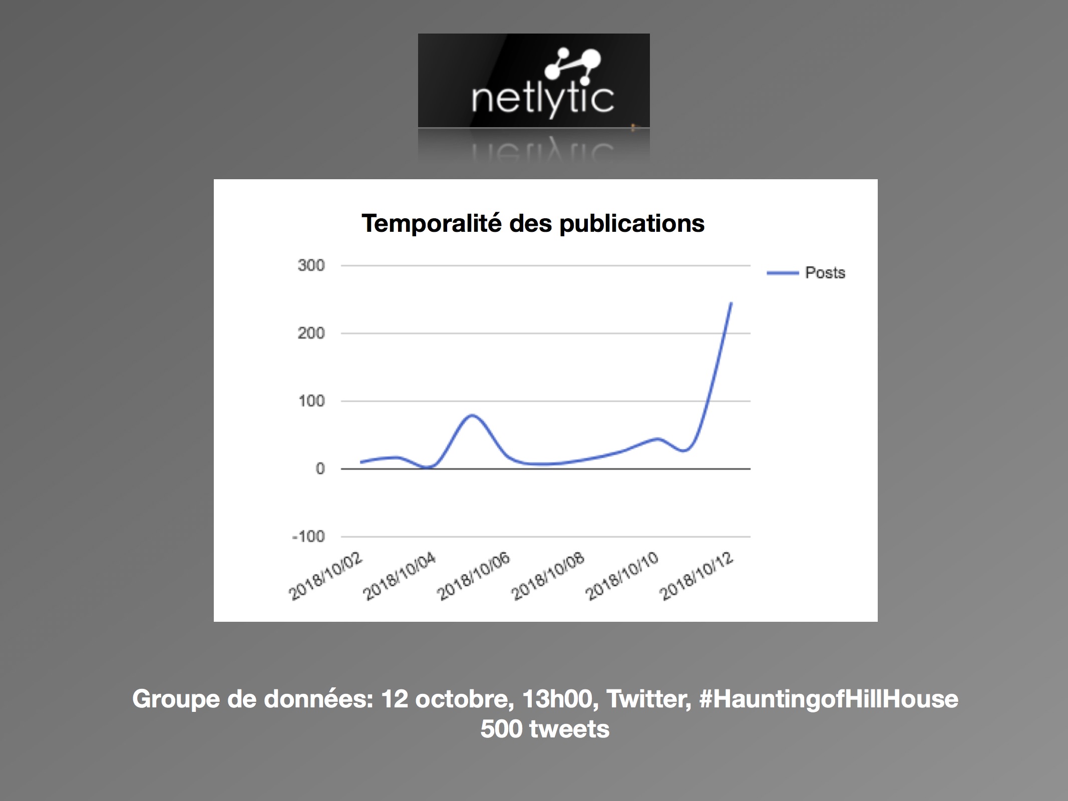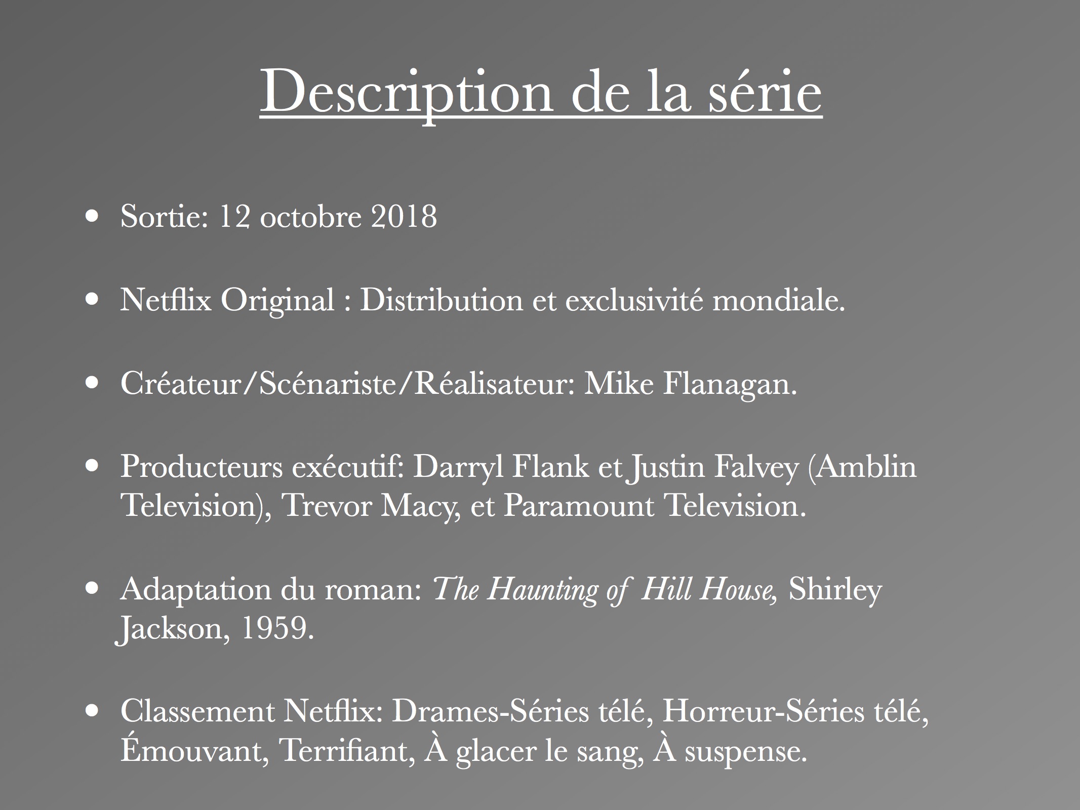 Cette recherche s’inscrit dans la continuité des travaux réalisés l’année dernière par le Labo Télé à propos des discours des spectateurs sur les plateformes numériques à l’aide d’outils d’analyse cartographiques. La nouvelle série d’horreur signée « Netflix Original » The Haunting of Hill House, a créé tout un évènement depuis sa sortie le 12 octobre dernier, entre autres par sa manière innovatrice d’intégrer l’horreur à la télévision. En suivant la formule inventée par le service de distribution en ligne, les dix épisodes de cinquante minutes ont été rendus disponibles d’un coup sur la plateforme, et ce mondialement. Elle est créée, scénarisée et réalisée par Mike Flanagan, déjà connu auprès des admirateurs de films d’horreur entre autres pour Oculus (2014), Hush (2016) et Gerald’s Game (2017). La série est l’adaptation du roman du même nom de l’Américaine Shirley Jackson, publié en 1959 qui a également été le sujet de deux films.