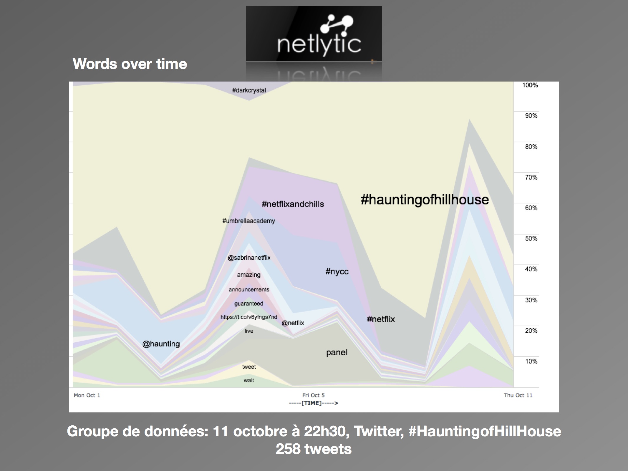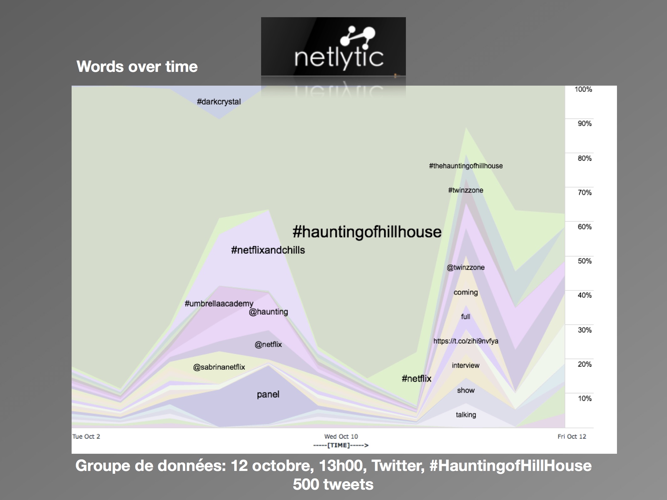 Avant le 12 octobre, la quantité de discours récoltée était généralement basse. En date du 10 octobre, peu d’activités étaient rattachées au mot-clic « #HautingofHillHouse » sur Twitter. De la même manière, les données étaient comparables entre Social Bearing et Netlytic, permettant ainsi aux deux sites de se valider entre eux. Tout d’abord, sur Social Bearing le graphique « Tweets By Type » nous fait remarquer que sur l’échantillon de 197 tweets retenus en dix jours, plus de la moitié était des « retweets », donc partagés. Le 11 octobre à 22 h 30, soit un peu plus d’une heure avant la sortie de la série, les échantillons recueillis avec le même mot-clic sur Twitter n’avaient pas beaucoup changé depuis la veille. Sur une période de dix jours, cette fois-ci un maximum de 260 tweets était récolté. Dans les nuages de mots et de mots-clics formés par les deux sites, nous mentionnons la présence des autres titres reliés aux « #Netflixandchills » et « #NetflixHorror » (tel que « #DarkCrystal » et « #UmbrellaAcademy »). Plus particulièrement sur Netlytic, qui permet la prise en compte des mentions aux utilisateurs, la page officielle de The Chilling Adventures of Sabrina prend sa place dans le top 10 des mots fréquents, et la carte « Network Analysis » démontre une forte concentration de tweets autour de cette page. Comme illustré, les tweets des utilisateurs inscrivent The Haunting of Hill House dans un réseau avec les autres séries du corpus « #NetflixandChills ». Autrement, les mots « can’t », « wait », « amazing » se retrouvent dans les nuages de mots.