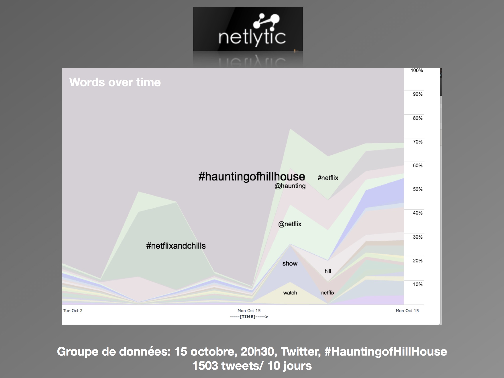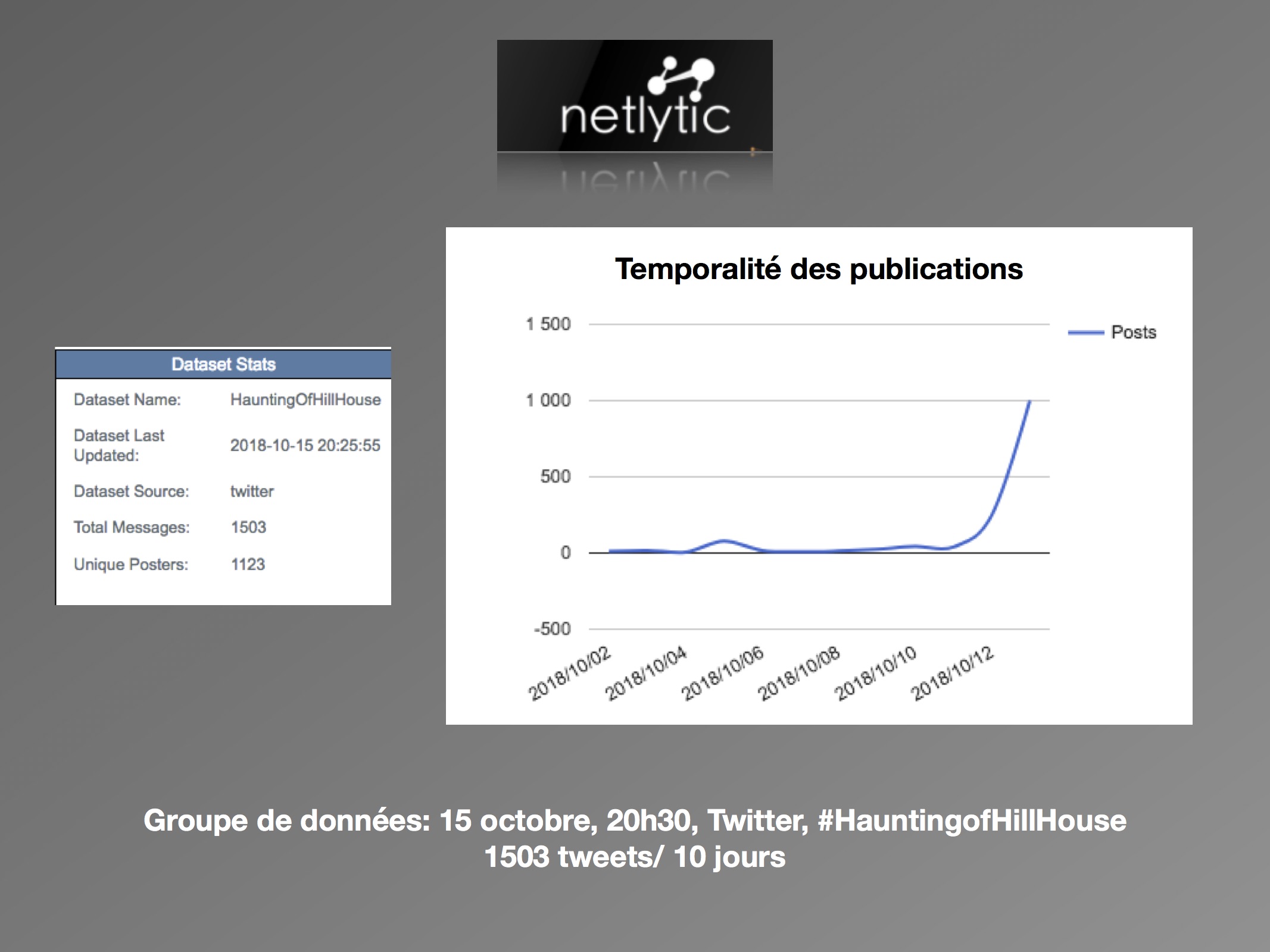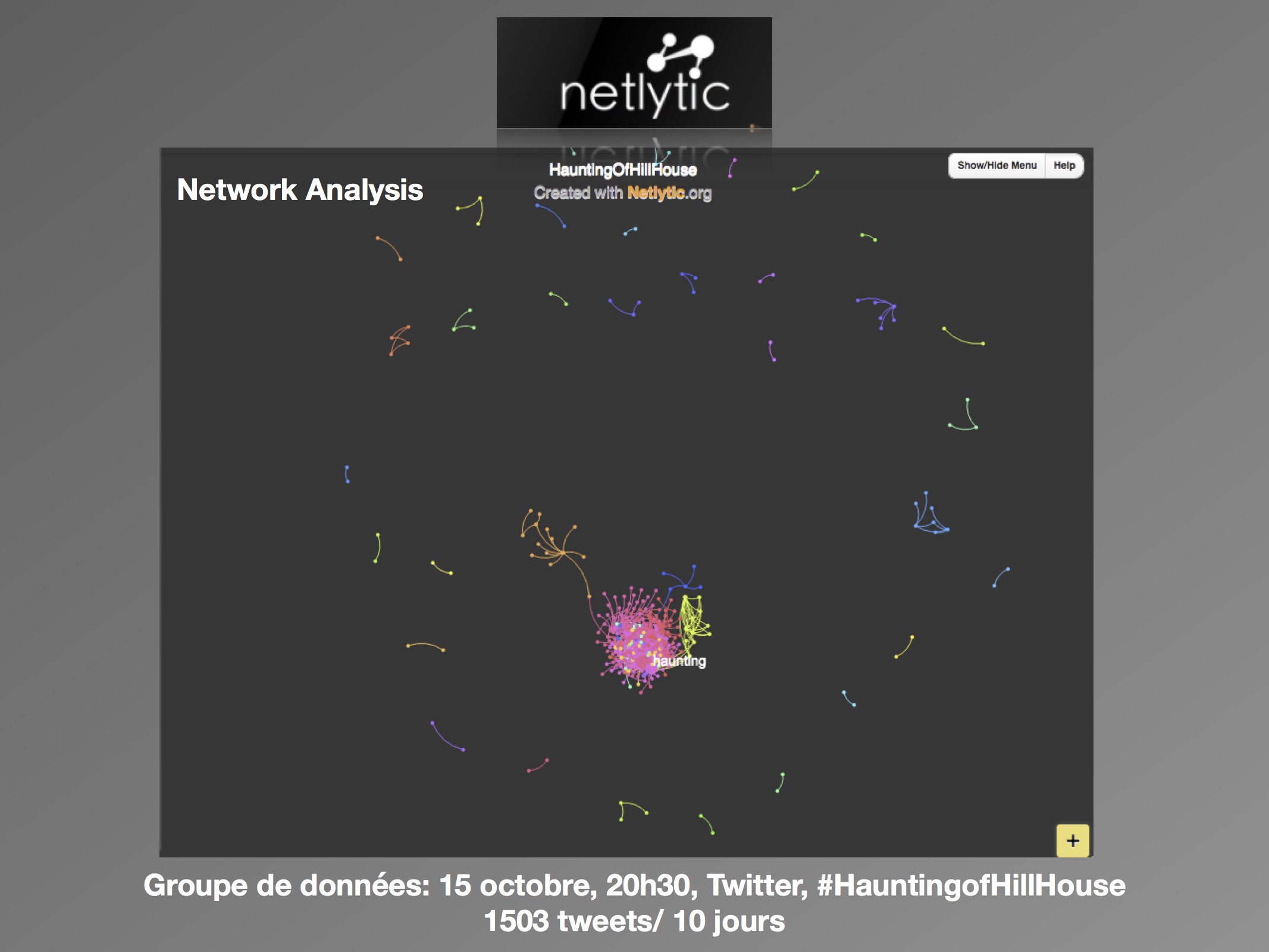 Trois jours plus tard, le lundi 15 octobre, le premier constat est frappant, il y a une nette augmentation des tweets, plus de 200 à l’heure. Selon Social Bearing, les nuages de mots formés sont plus variés, et ces nouveaux termes nous indiquent que les utilisateurs discutent autour du contenu et de la qualité de la série. Désormais, les personnages (« #lukeandnellie », « #twins »), les éléments d’horreur (« #basementghost », « horror ») et l’ambiance (« #spoopy », « #psychologicalthriller », « spooky », « #masterpiece ») sont les termes privilégiés. Sur Netlytic, l’échantillon créé le 15 octobre pour le mot-clic « #HauntingofHillHouse » est de 1500 tweets sur une période de dix jours. Ainsi, il couvre l’avant et l’après de la sortie, toutefois la ligne du temps démontre que la moitié des tweets ont été envoyés après le 12 octobre, et donc qu’il représente en majorité les réactions après la diffusion. Dans ce bassin plus large, les termes se ressemblent beaucoup, nous obtenons « episode », « #tvtime », « watched » et « horror » dans les nuages. L’outil « Network Analysis » démontre des discours plus éclatés entre les utilisateurs, qui ne sont plus concentrés autour des pages officielles des séries, comme c’était le cas avant la diffusion.