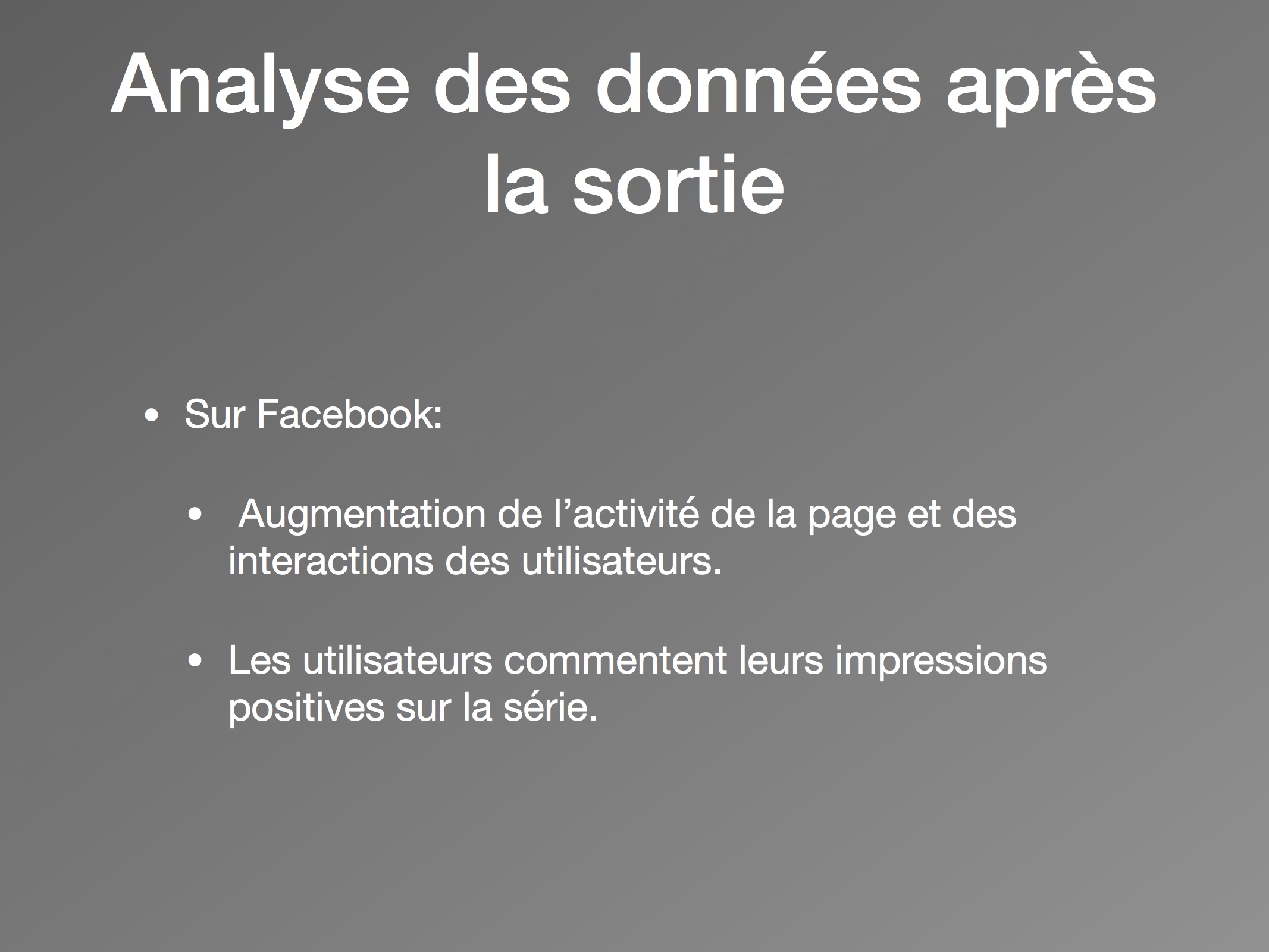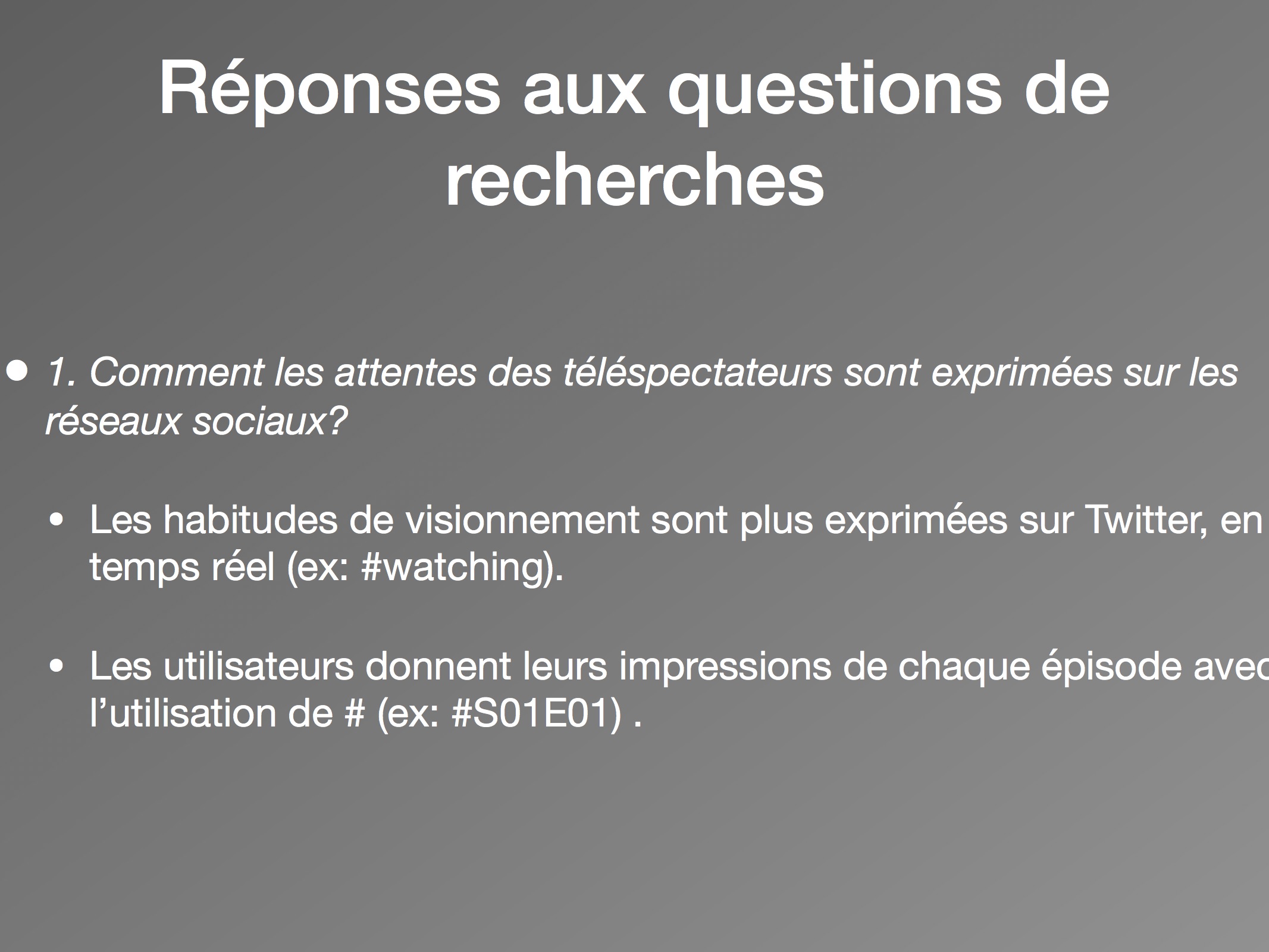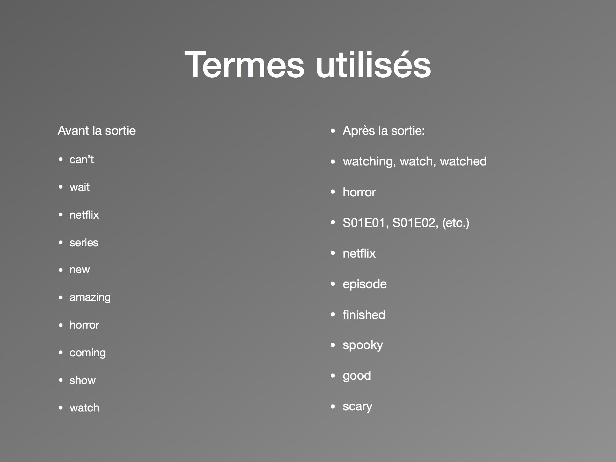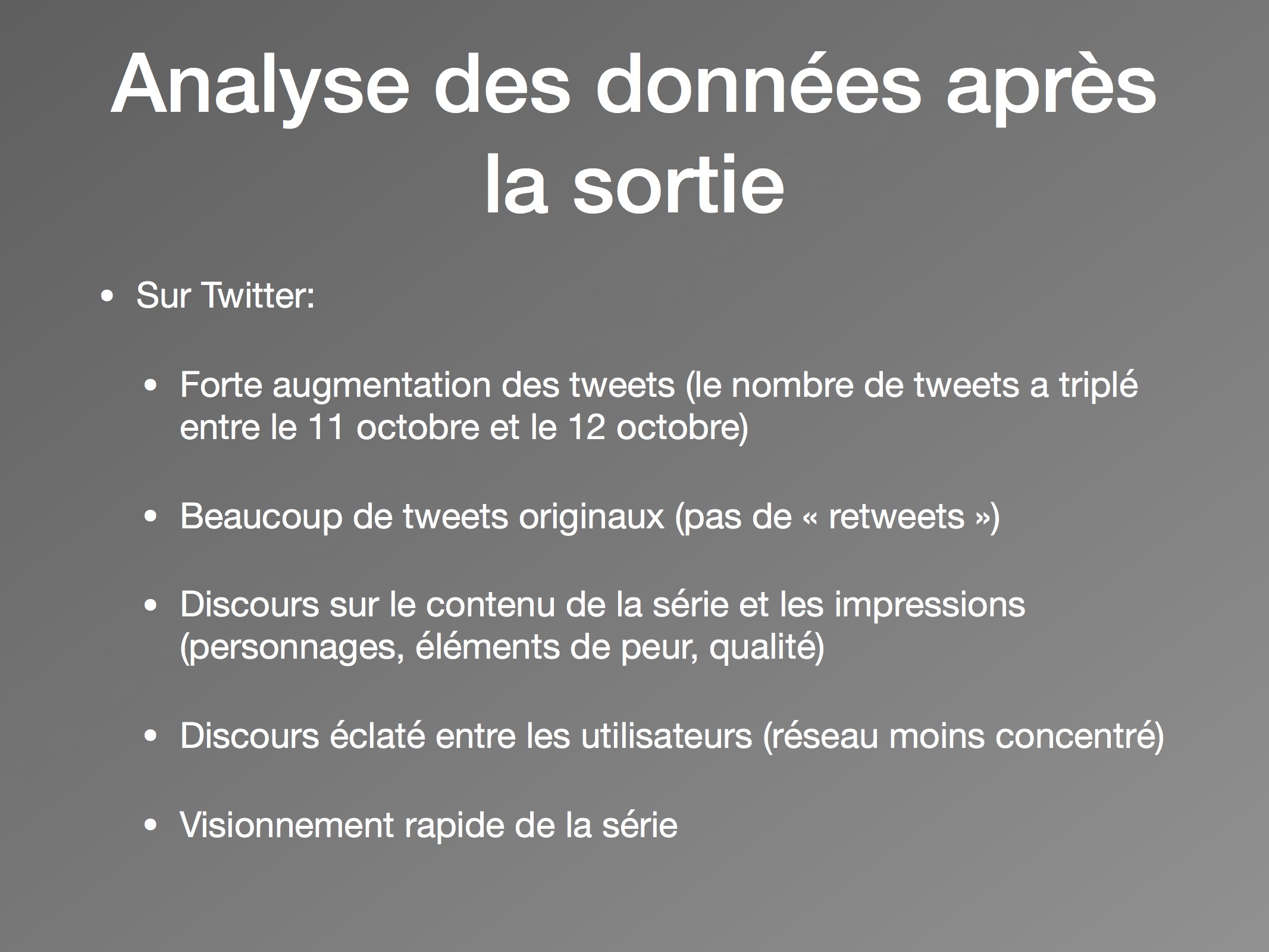 Ainsi, après la sortie de la série il y a un changement des types de discours important, plus particulièrement dans le contenu des tweets. Les utilisateurs discutent de leur visionnement de la série, de leurs impressions et émotions. En mentionnant l’épisode auquel ils sont rendus (avec des mots-clics comme « #s01e01 »), ils conversent directement de leur réaction au contenu. Les personnages et la peur ressentie devant la série deviennent les sujets privilégiés. Les utilisateurs commentent leurs habitudes de visionnement en direct et en temps réel, ce qui encourage une consommation rapide des épisodes.