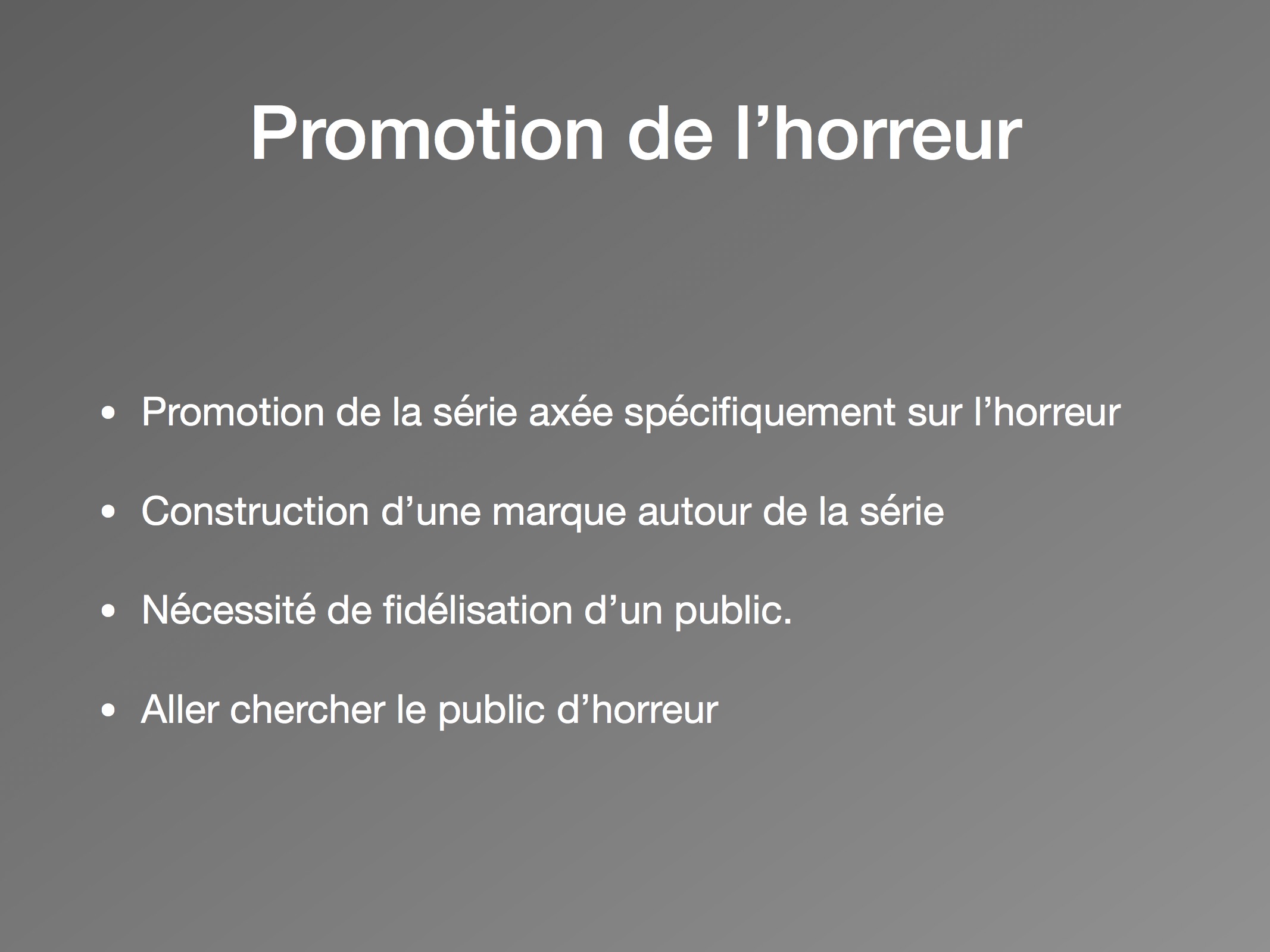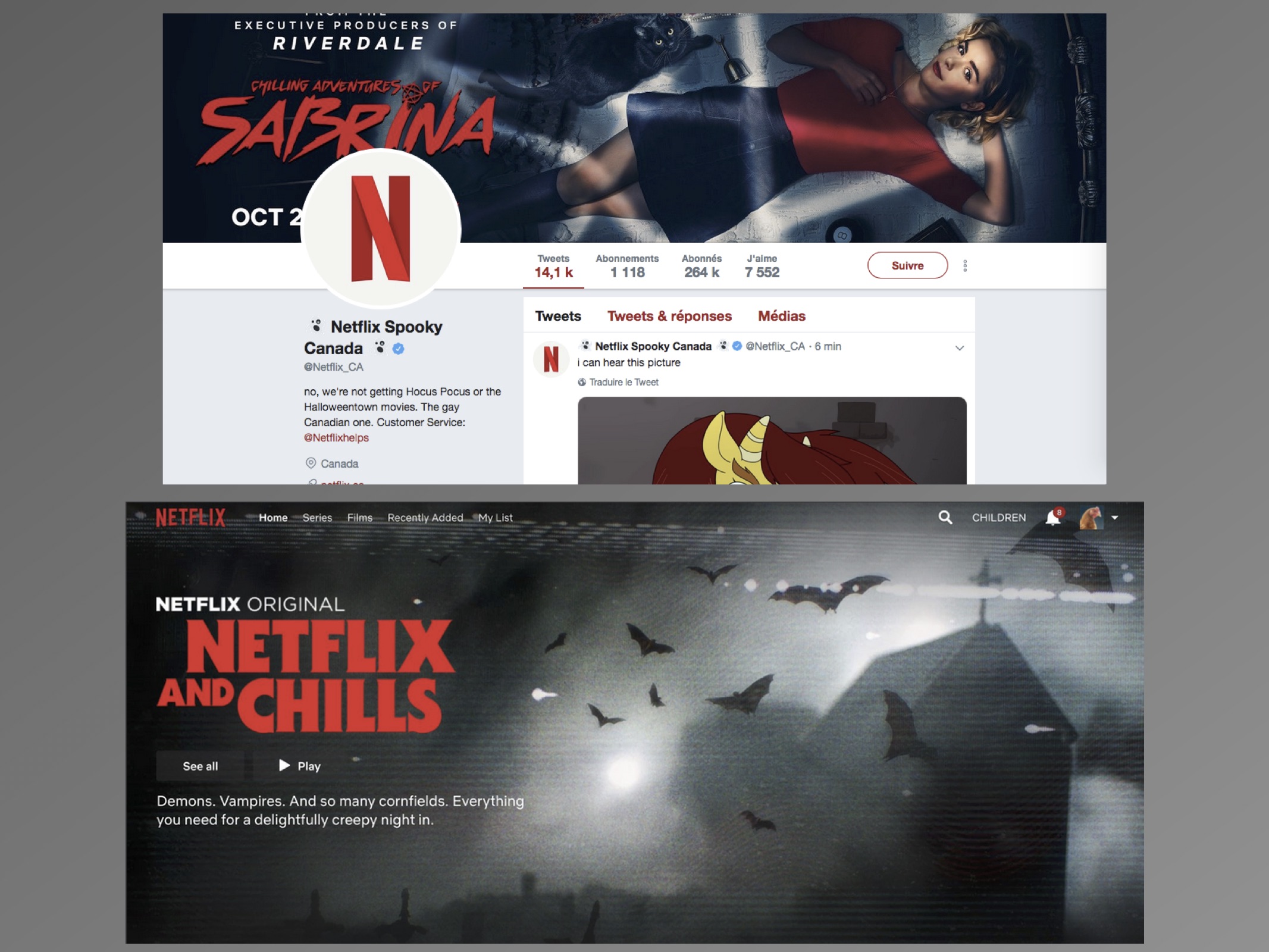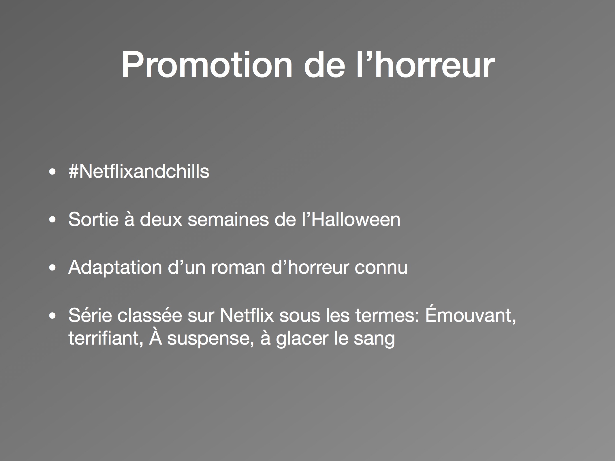 Dans l’intention d’attirer un public déterminé et de le fidéliser, Netflix a misé sur l’horreur pour promouvoir sa série sur sa plateforme et ses réseaux. En inscrivant la série dans l’actualité du mois d’octobre, le mois de l’Halloween, Netflix présente sa série comme un évènement et encourage ses abonnés à la consommer rapidement, et ce avant le 31 octobre. Surtout, Netflix propulse le mois de l’horreur et son mot-clic « NetflixandChills » sur Twitter. Il rassemble les contenus originaux The Chilling Adventures of Sabrina, Dark Crystal et Umbrella Academy sous un même ensemble. Le mois de l’horreur promet tout le nécessaire pour une soirée effrayante : « Demons. Vampires. And so many cornfields. Everything you need for a delightfully creepy night in » peut-on lire sur la page d’accueil du site. Haunting of Hill House s’illustre d’une plus grande stratégie publicitaire de la part de son distributeur. Ainsi, en associant presque exclusivement la série au genre de l’horreur, celle-ci apporte son lot d’attentes spécifiques au genre telles que la promesse de la peur et des émotions fortes, la promesse d’un dénouement inattendu et d’un univers gothique.