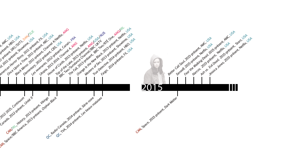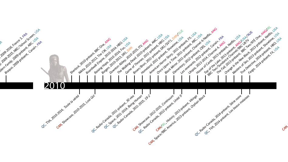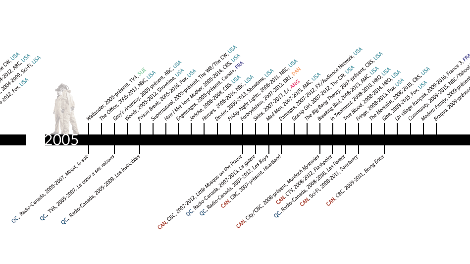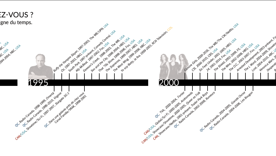 Le corpus comprend une variété de séries contemporaines diffusées depuis les années 1990 sur la scène québécoiseou à l’international (notamment aux États-Unis). Volontairement élargi, il se veut représentatif du potentiel transnational et transculturel de création de mondes des programmes sériels. Une sélection de webséries québécoises récentes témoigne en outre de l’évolution des formats sériels à l’ère des nouveaux médias.